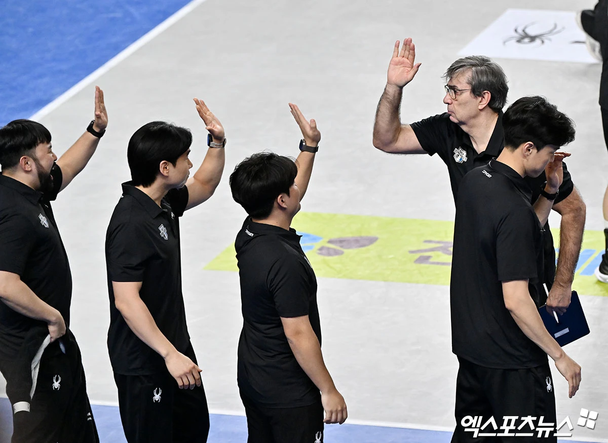 이날 경기에서 승리한 현대캐피탈 필립 블랑 감독이 코칭스태프와 하이파이브를 하고 있다.