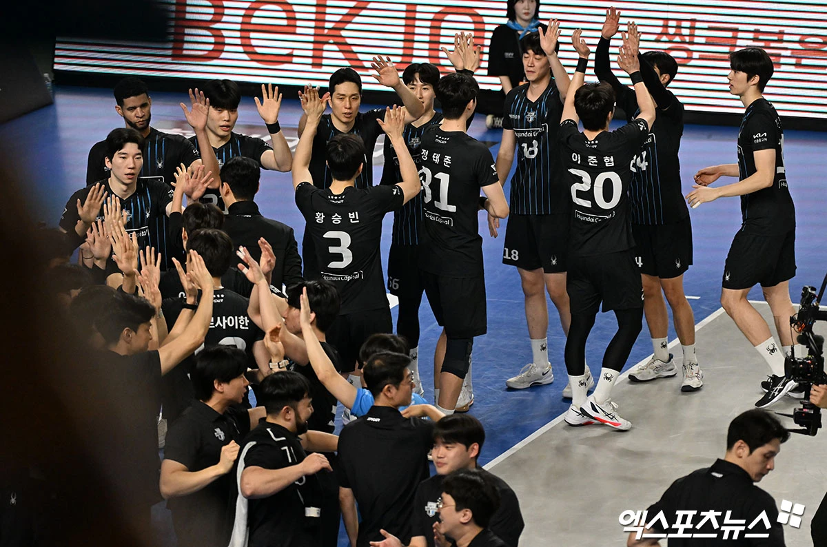 이날 경기에서 승리한 현대캐피탈 선수들이 기뻐하고 있다.