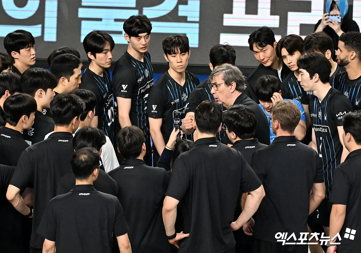 이날 경기에서 승리한 현대캐피탈 필립 블랑 감독이 미팅을 갖고 있다.