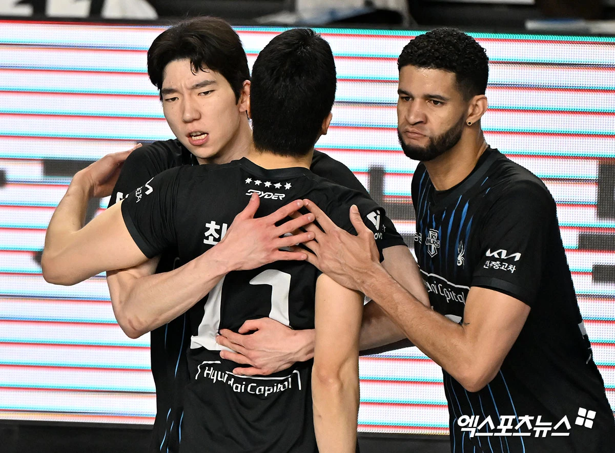 이날 경기에서 승리한 현대캐피탈 선수들이 기뻐하고 있다.