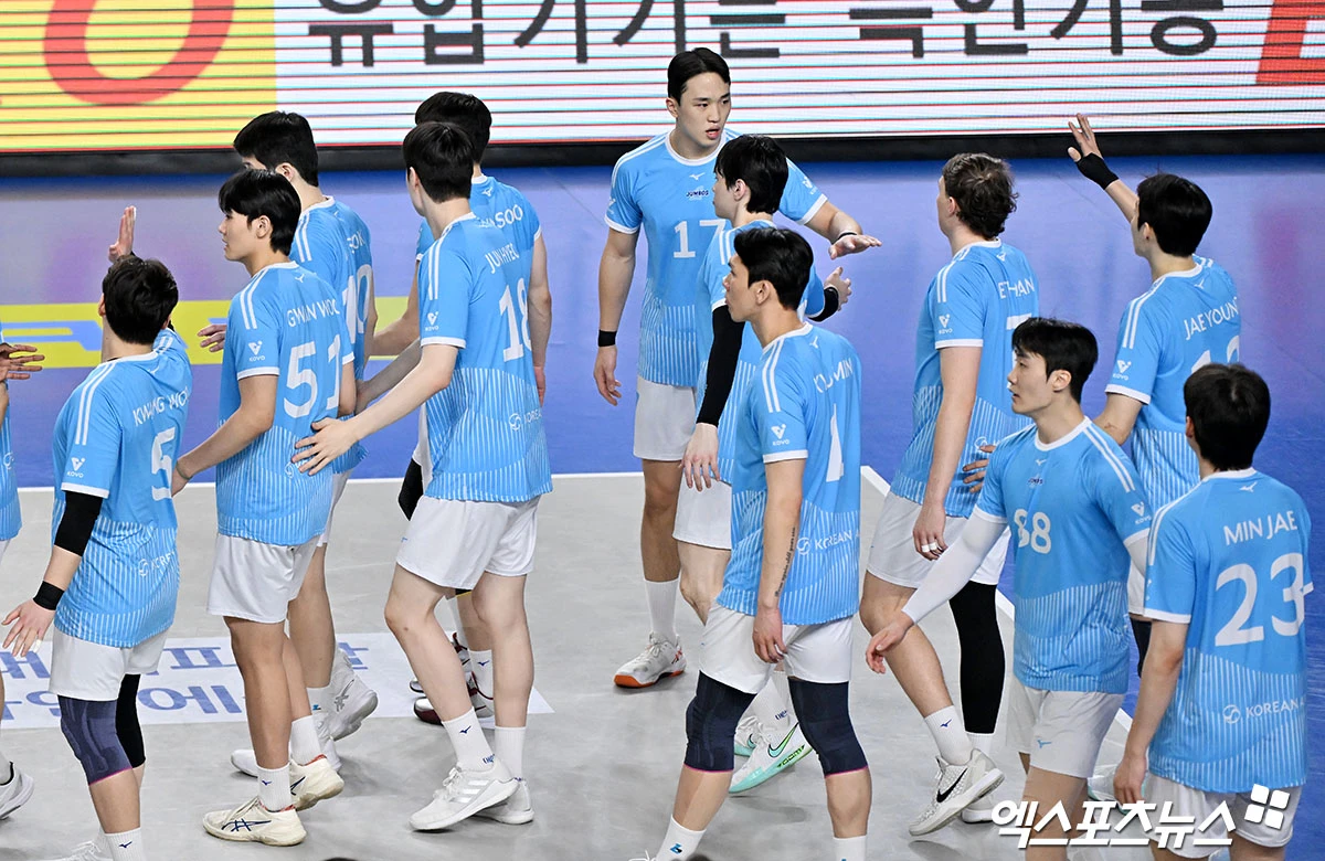 경기종료 후 대한항공 선수들이 아쉬워하고 있다.