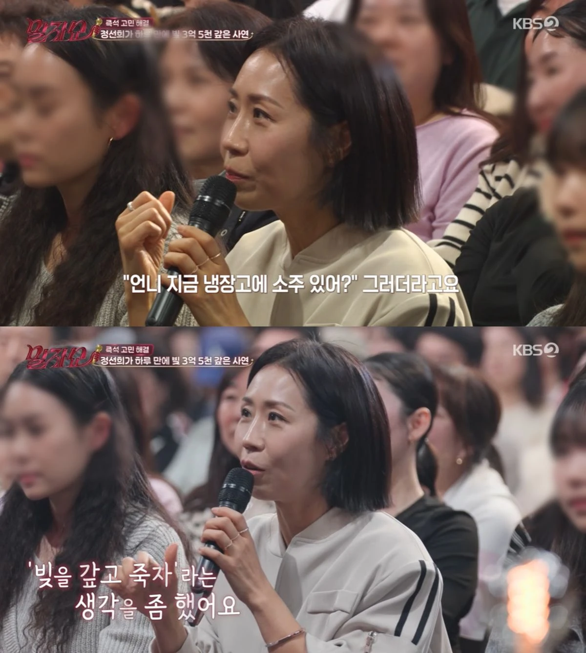정선희는 "집이 경매로 넘어갈 무렵 하루 만에 그렇게 도와주셨다"고 했다. 이어 "저는 I다. 무대에서 불 꺼지면 이야기 못하는 스타일이다. 홍진경 씨가 저한테 '언니 지금 냉장고에 소주 있어? 그거 반 병만 때려 넣어라. 그리고 용기를 내서 전화를 돌려' 했다"고 당시 있었던 일을 전했다.