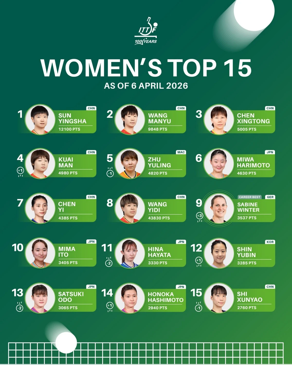현재 11위는 2계단 하락한 하야타 히나(일본∙3330포인트), 10위는 자리르 지킨 이토 미마(일본∙3405포인트)다. 9위는 신유빈과 함께 월드컵 동메달을 받은 자비네 빈터(독일∙3537포인트)로 무려 세 계단 상승해 커리어 최고 순위를 찍었다.
