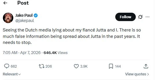 보도에 따르면 폴은 지난 6일 밤 자신의 X(구 트위터) 계정을 통해 "네덜란드 언론이 나와 약혼녀 유타에 대해 거짓말을 하고 있는 것을 보고 있다"며 "지난 몇 년 동안 유타에 대한 허위 정보가 너무 많이 퍼졌다. 이제는 멈춰야 한다"고 밝혔다.