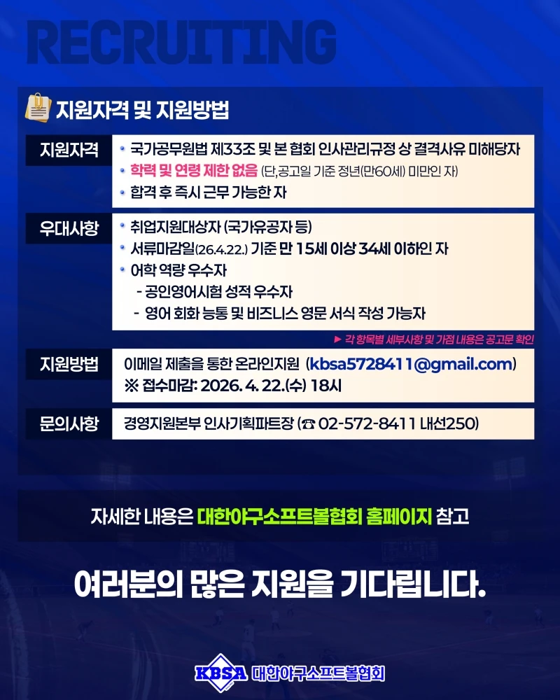 (엑스포츠뉴스 유준상 기자) 대한야구소프트볼협회(KBSA)가 한국 야구와 소프트볼의 발전을 함께 이끌어갈 참신하고 역량 있는 신입사원을 공개 채용한다.
