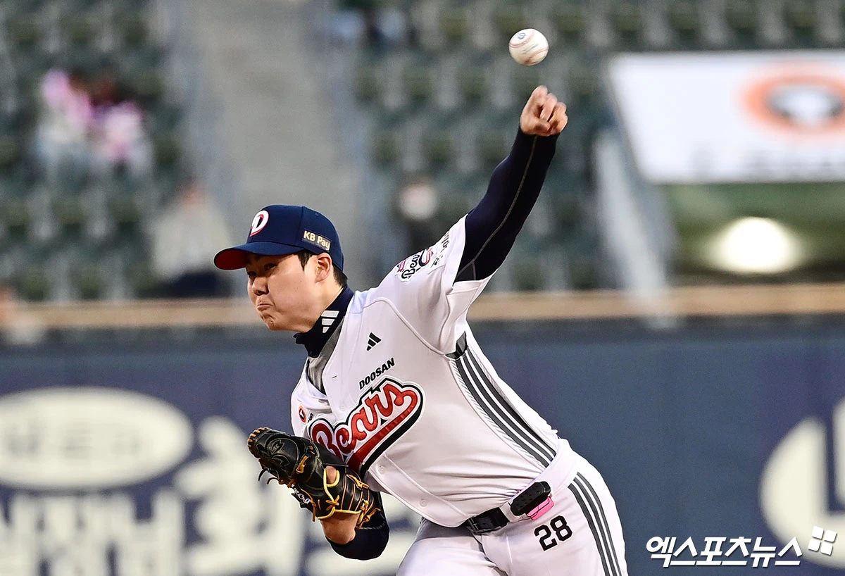 (엑스포츠뉴스 잠실, 박지영 기자) 7일 오후 서울 송파구 잠실야구장에서 열린 '2026 신한 SOL Bank KBO리그' 키움 히어로즈와 두산 베어스의 경기, 1회초 두산 선발투수 최승용이 역투하고 있다.