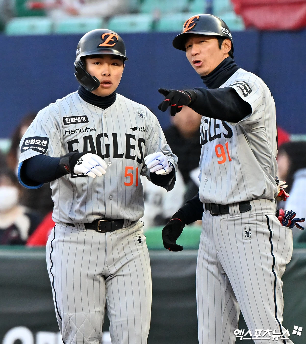 (엑스포츠뉴스 인천, 김한준 기자) 7일 오후 인천SSG랜더스필드에서 열린 '2026 신한 SOL Bank KBO리그' 한화 이글스와 SSG 랜더스의 경기, 1회초 1사 2루 한화 문현빈이 1타점 적시타를 날리고 있다.