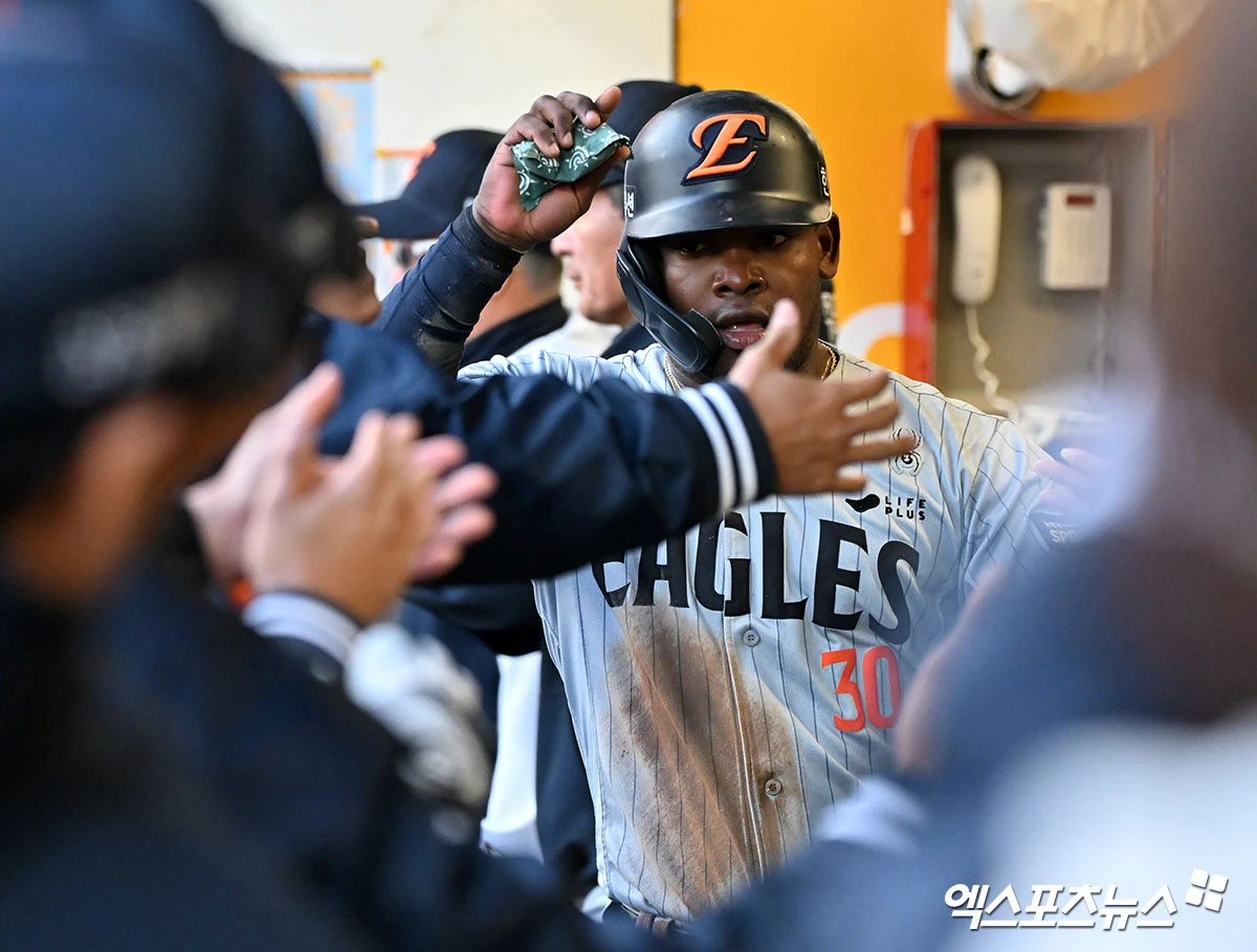 (엑스포츠뉴스 인천, 김한준 기자) 7일 오후 인천SSG랜더스필드에서 열린 '2026 신한 SOL Bank KBO리그' 한화 이글스와 SSG 랜더스의 경기, 1회초 1사 2루 한화 페라자가 문현빈의 1타점 적시타때 득점에 성공하고 있다.