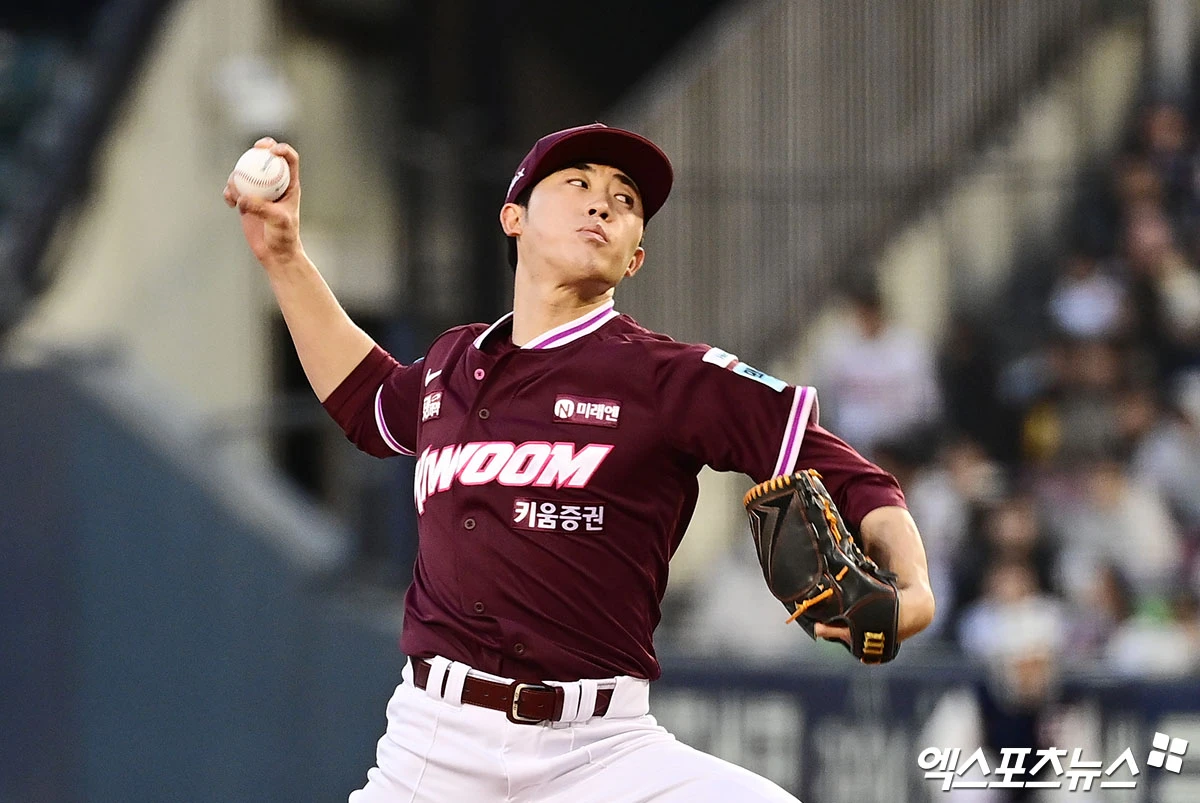 (엑스포츠뉴스 잠실, 박지영 기자) 7일 오후 서울 송파구 잠실야구장에서 열린 '2026 신한 SOL Bank KBO리그' 키움 히어로즈와 두산 베어스의 경기, 1회말 키움 선발투수 배동현이 역투하고 있다.
