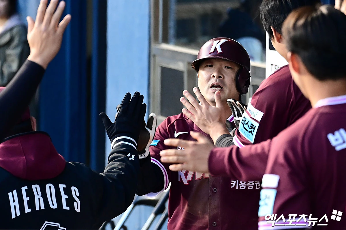 (엑스포츠뉴스 잠실, 박지영 기자) 7일 오후 서울 송파구 잠실야구장에서 열린 '2026 신한 SOL Bank KBO리그' 키움 히어로즈와 두산 베어스의 경기, 2회초 1사 2루 키움 어준서 타석 때 2루주자 이형종이 두산 포수 양의지의 포일을 틈타 홈으로 쇄도하며 득점을 올린 뒤 더그아웃서 동료들과 하이파이브를 나누고 있다.