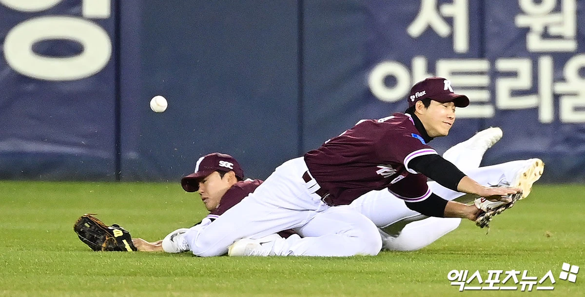 (엑스포츠뉴스 잠실, 박지영 기자) 7일 오후 서울 송파구 잠실야구장에서 열린 '2026 신한 SOL Bank KBO리그' 키움 히어로즈와 두산 베어스의 경기, 2회말 1사 두산 카메론의 2루타 때 키움 중견수 이주형과 우익수 박찬혁이 타구를 잡지 못하고 있다.
