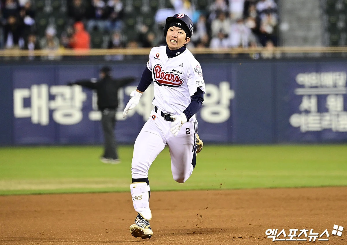 (엑스포츠뉴스 잠실, 박지영 기자) 7일 오후 서울 송파구 잠실야구장에서 열린 '2026 신한 SOL Bank KBO리그' 키움 히어로즈와 두산 베어스의 경기, 2회말 두산 선두타자 김민석이 3루타를 때려내고 있다.