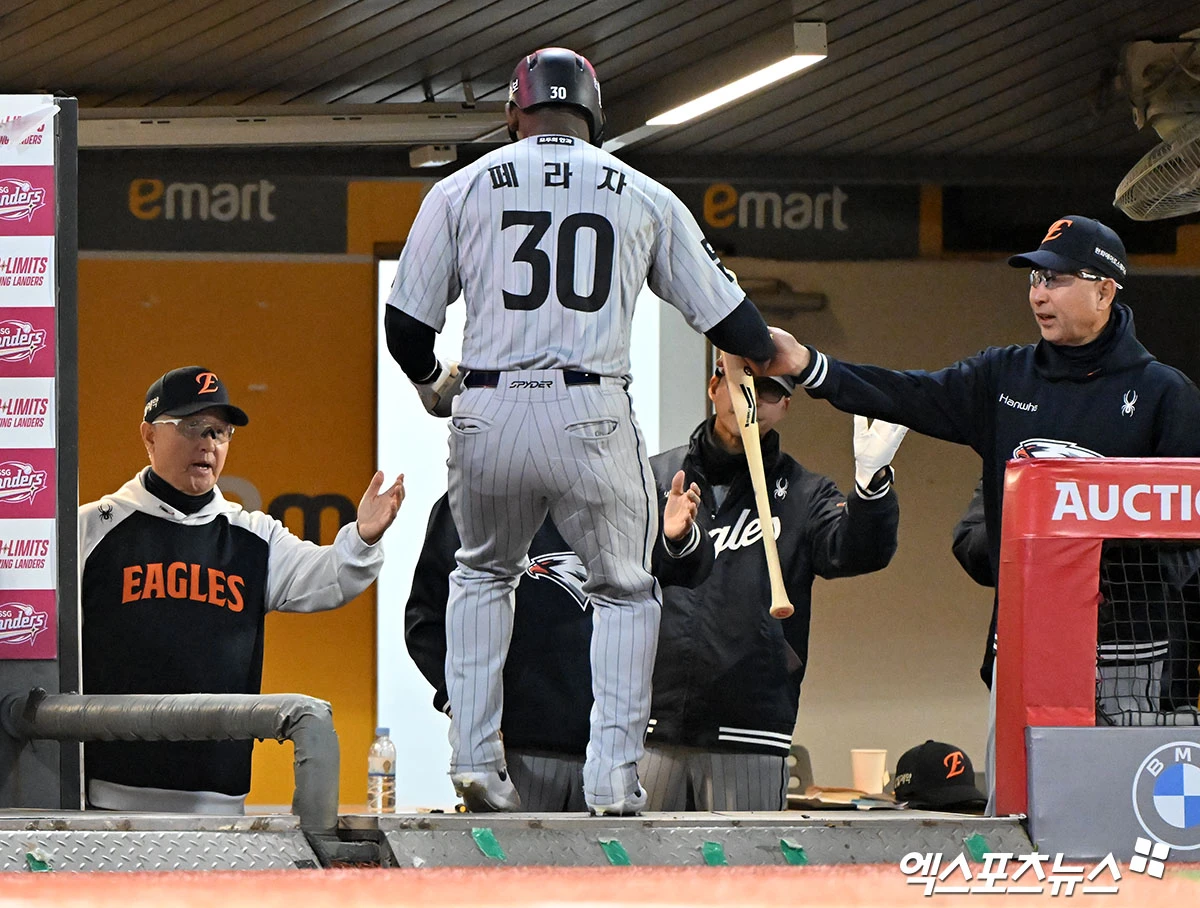 (엑스포츠뉴스 인천, 김한준 기자) 7일 오후 인천SSG랜더스필드에서 열린 '2026 신한 SOL Bank KBO리그' 한화 이글스와 SSG 랜더스의 경기, 3회초 2사 만루 한화 페라자가 하주석의 2타점 적시타때 득점에 성공하고 있다.