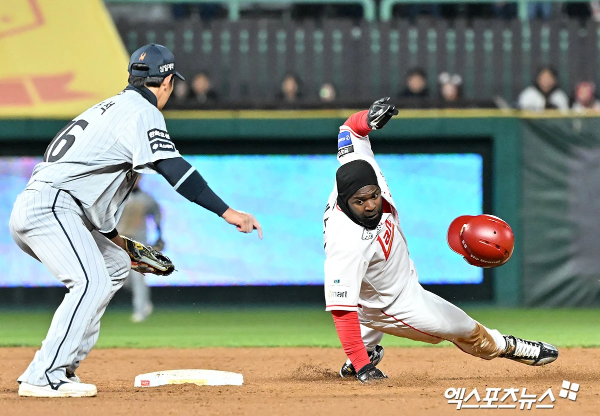 (엑스포츠뉴스 인천, 김한준 기자) 7일 오후 인천SSG랜더스필드에서 열린 '2026 신한 SOL Bank KBO리그' 한화 이글스와 SSG 랜더스의 경기, 3회말 2사 1루 SSG 에레디아가 2루 도루를 시도하고 있다.