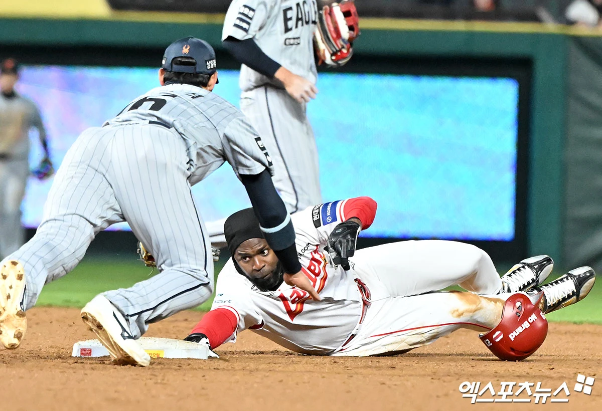 (엑스포츠뉴스 인천, 김한준 기자) 7일 오후 인천SSG랜더스필드에서 열린 '2026 신한 SOL Bank KBO리그' 한화 이글스와 SSG 랜더스의 경기, 3회말 2사 1루 SSG 에레디아가 2루 도루를 시도하고 있다.