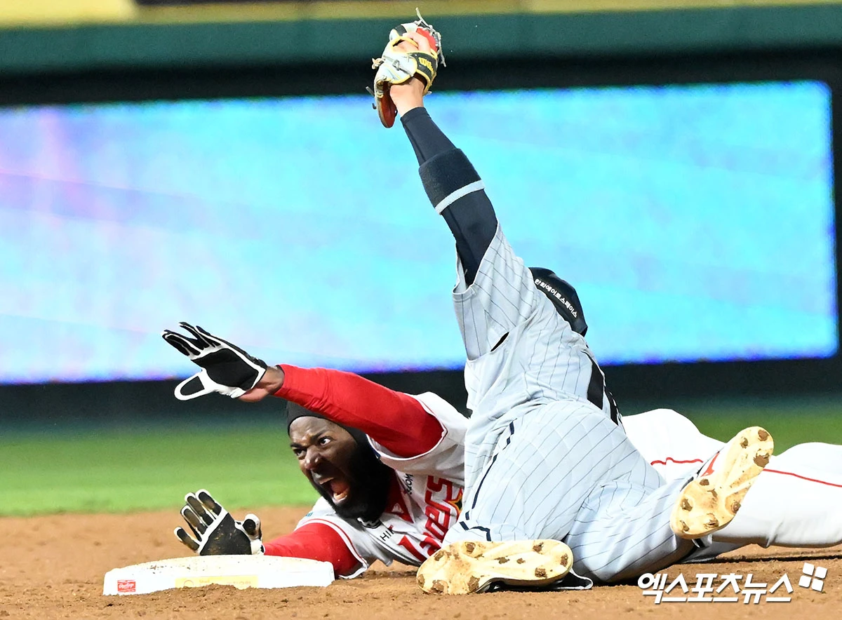 (엑스포츠뉴스 인천, 김한준 기자) 7일 오후 인천SSG랜더스필드에서 열린 '2026 신한 SOL Bank KBO리그' 한화 이글스와 SSG 랜더스의 경기, 3회말 2사 1루 SSG 에레디아가 2루 도루를 시도하고 있다.