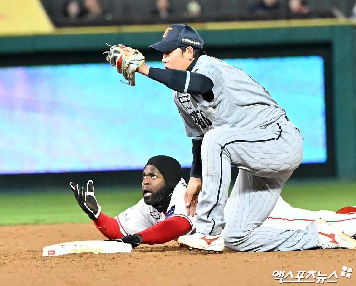 (엑스포츠뉴스 인천, 김한준 기자) 7일 오후 인천SSG랜더스필드에서 열린 '2026 신한 SOL Bank KBO리그' 한화 이글스와 SSG 랜더스의 경기, 3회말 2사 1루 SSG 에레디아가 2루 도루를 시도하고 있다.