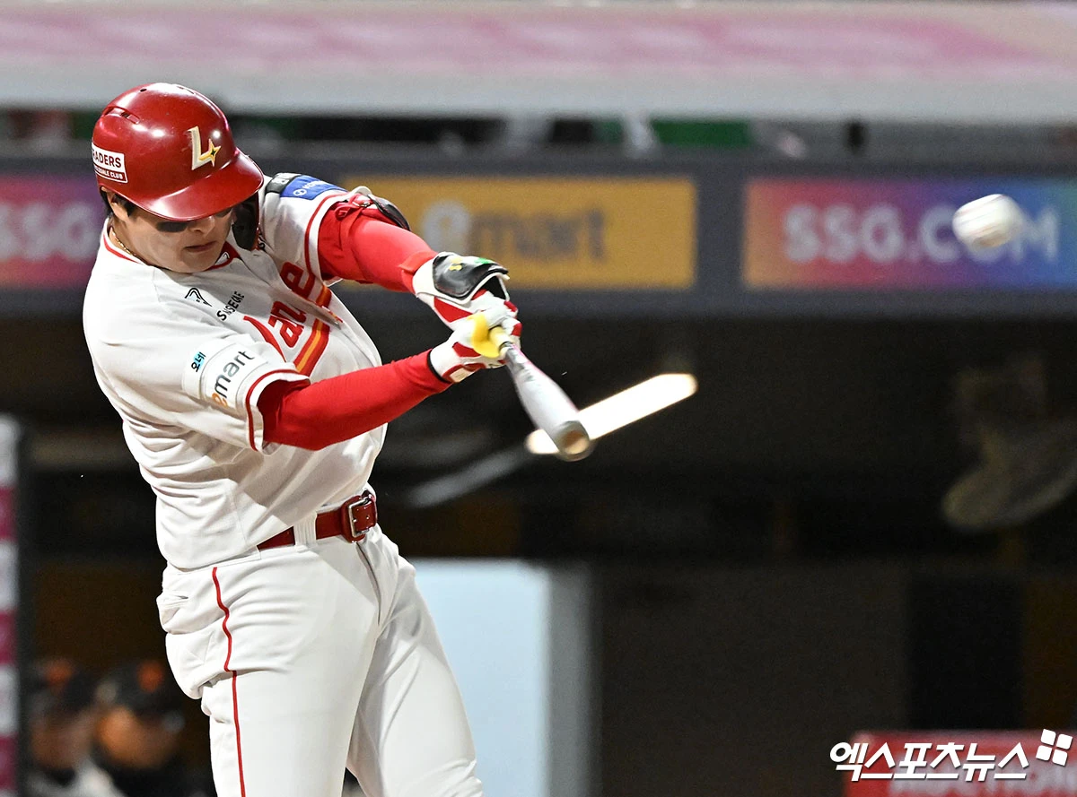 (엑스포츠뉴스 인천, 김한준 기자) 7일 오후 인천SSG랜더스필드에서 열린 '2026 신한 SOL Bank KBO리그' 한화 이글스와 SSG 랜더스의 경기, 4회말 1사 1루 SSG 고명준이 2루타를 날리고 있다.