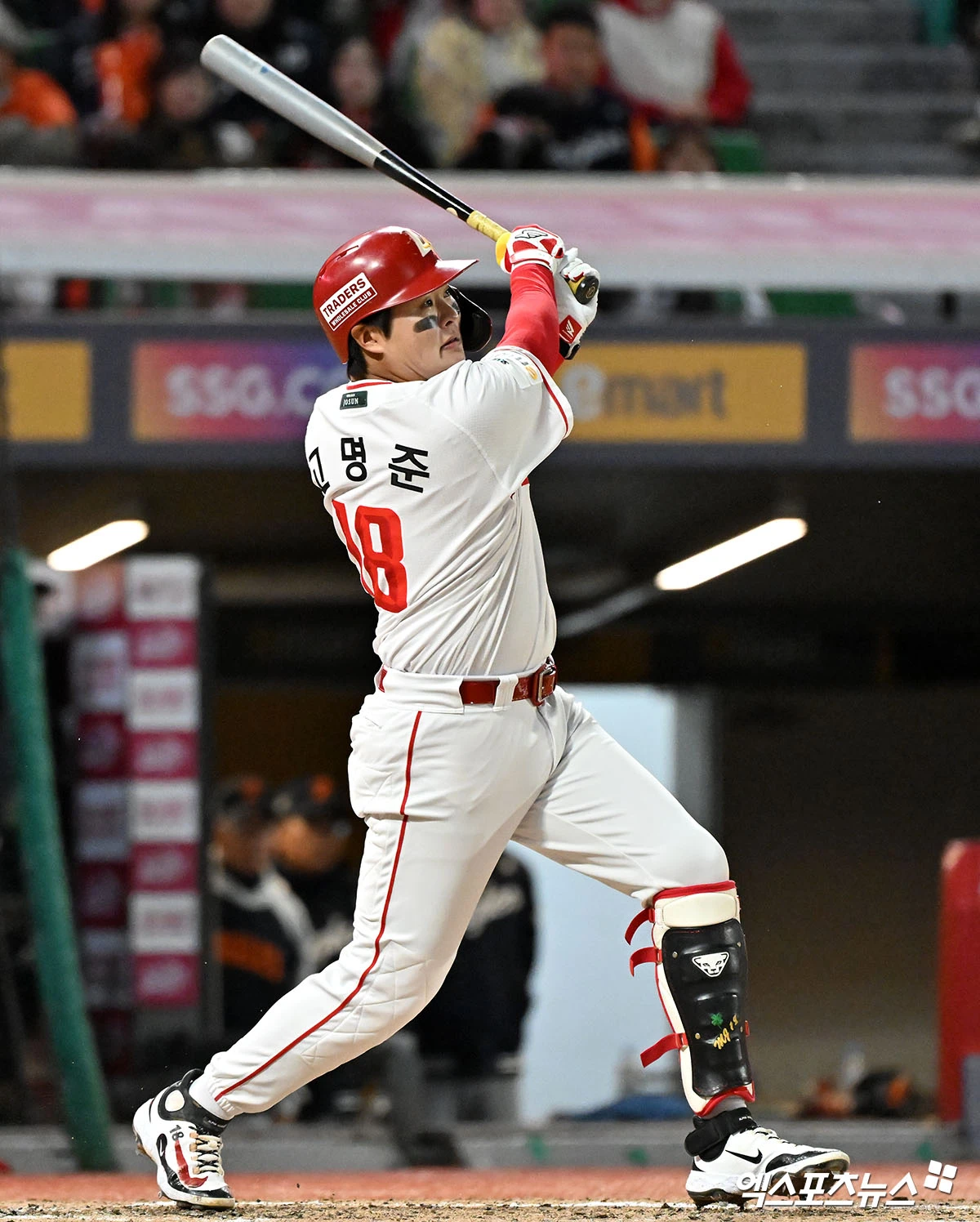 (엑스포츠뉴스 인천, 김한준 기자) 7일 오후 인천SSG랜더스필드에서 열린 '2026 신한 SOL Bank KBO리그' 한화 이글스와 SSG 랜더스의 경기, 4회말 1사 1루 SSG 고명준이 2루타를 날리고 있다.