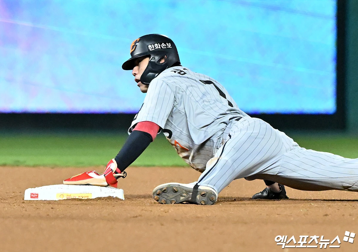(엑스포츠뉴스 인천, 김한준 기자) 7일 오후 인천SSG랜더스필드에서 열린 '2026 신한 SOL Bank KBO리그' 한화 이글스와 SSG 랜더스의 경기, 6회초 1사 1,3루 한화 심우준이 2루 도루를 시도하고 있다.