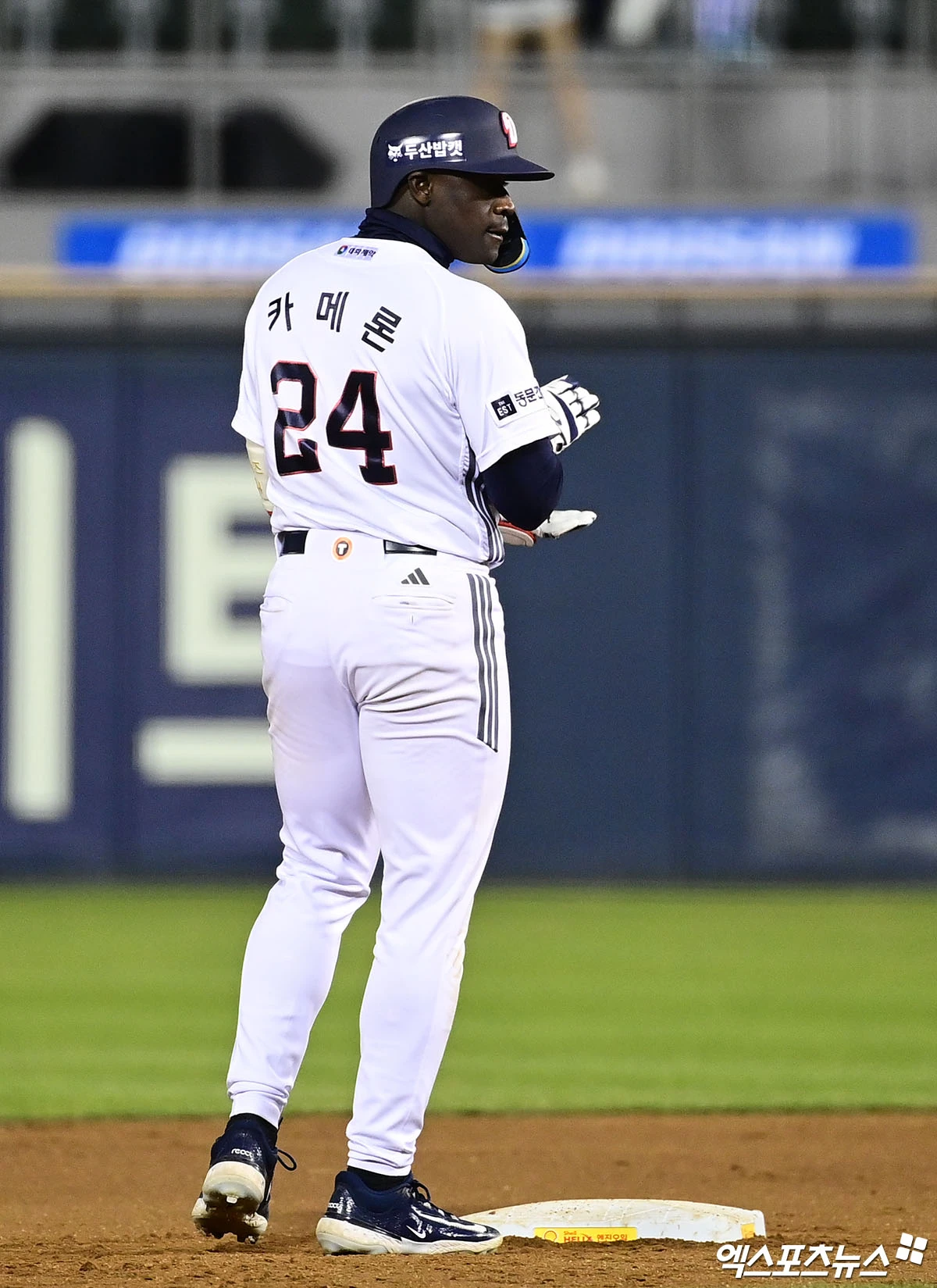 (엑스포츠뉴스 잠실, 박지영 기자) 7일 오후 서울 송파구 잠실야구장에서 열린 '2026 신한 SOL Bank KBO리그' 키움 히어로즈와 두산 베어스의 경기, 6회말 1사 1루 두산 카메론이 2루타를 때려내고 있다.
