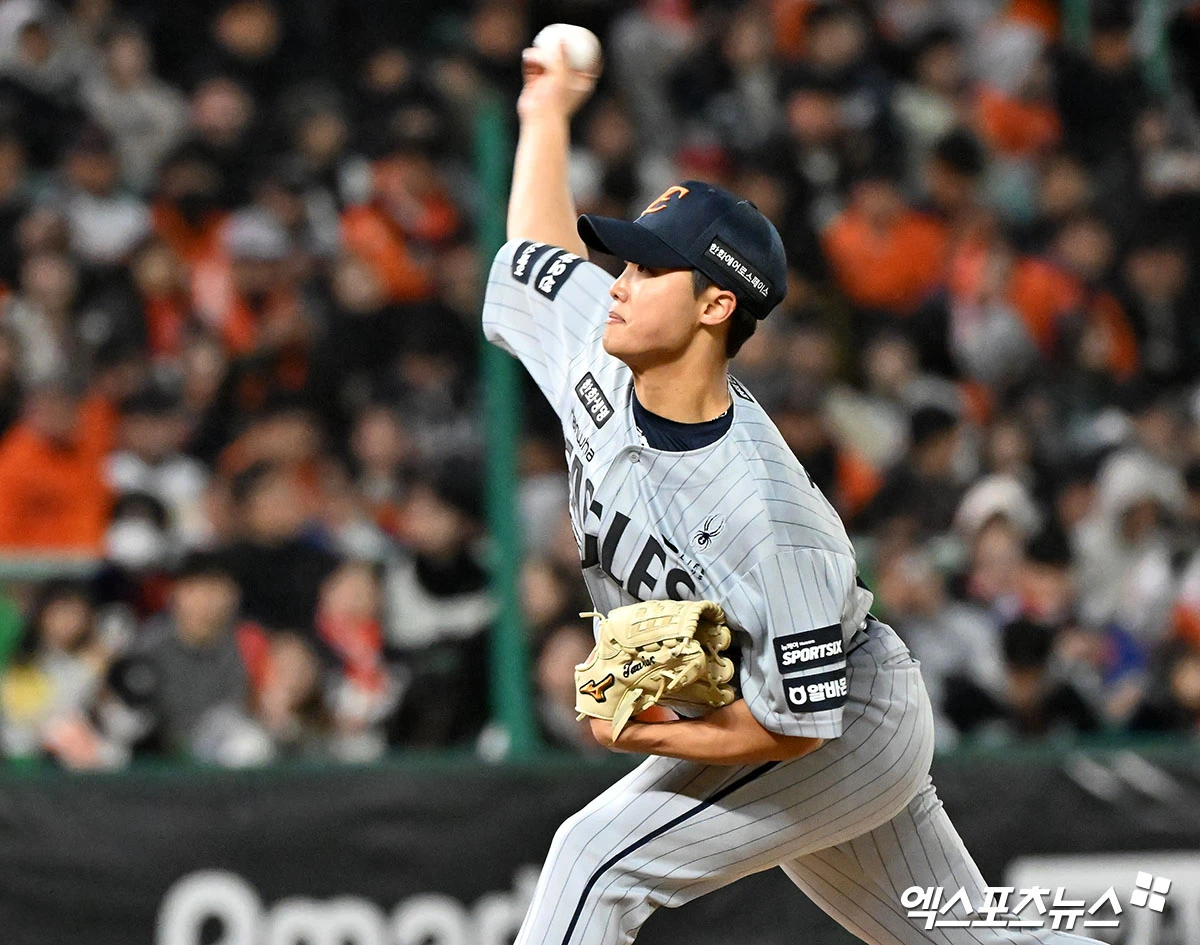 (엑스포츠뉴스 인천, 김한준 기자) 7일 오후 인천SSG랜더스필드에서 열린 '2026 신한 SOL Bank KBO리그' 한화 이글스와 SSG 랜더스의 경기, 8회말 한화 정우주가 공을 힘차게 던지고 있다.