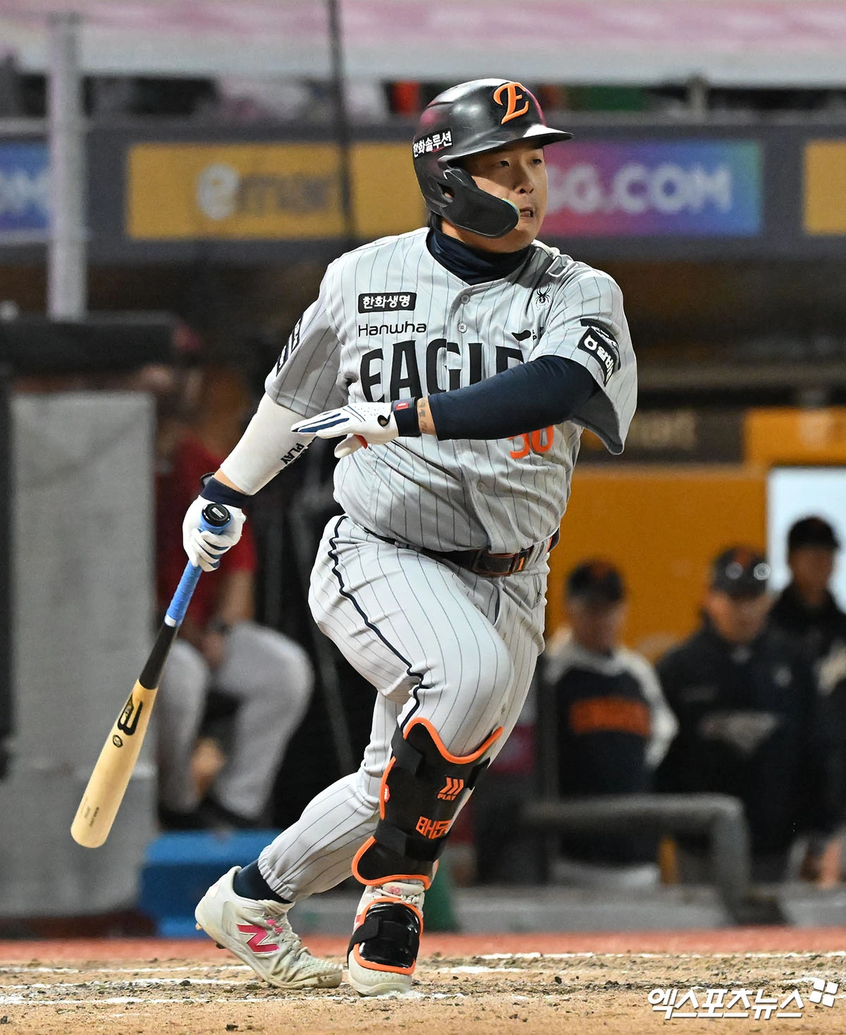 (엑스포츠뉴스 인천, 김한준 기자) 7일 오후 인천SSG랜더스필드에서 열린 '2026 신한 SOL Bank KBO리그' 한화 이글스와 SSG 랜더스의 경기, 9회초 1사 1,2루 한화 강백호가 1타점 적시타를 날리고 있다.