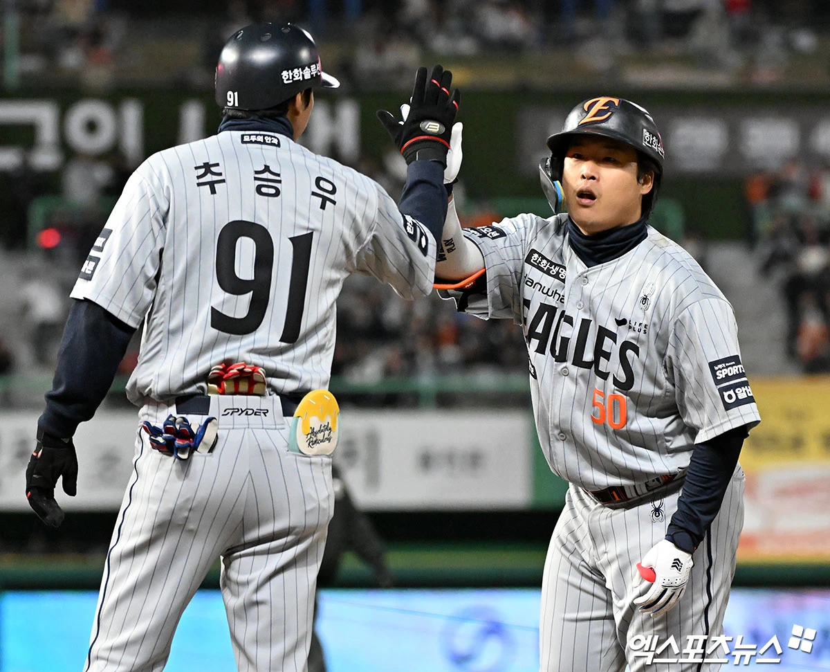 (엑스포츠뉴스 인천, 김한준 기자) 7일 오후 인천SSG랜더스필드에서 열린 '2026 신한 SOL Bank KBO리그' 한화 이글스와 SSG 랜더스의 경기, 9회초 1사 1,2루 한화 강백호가 1타점 적시타를 날리고 있다.