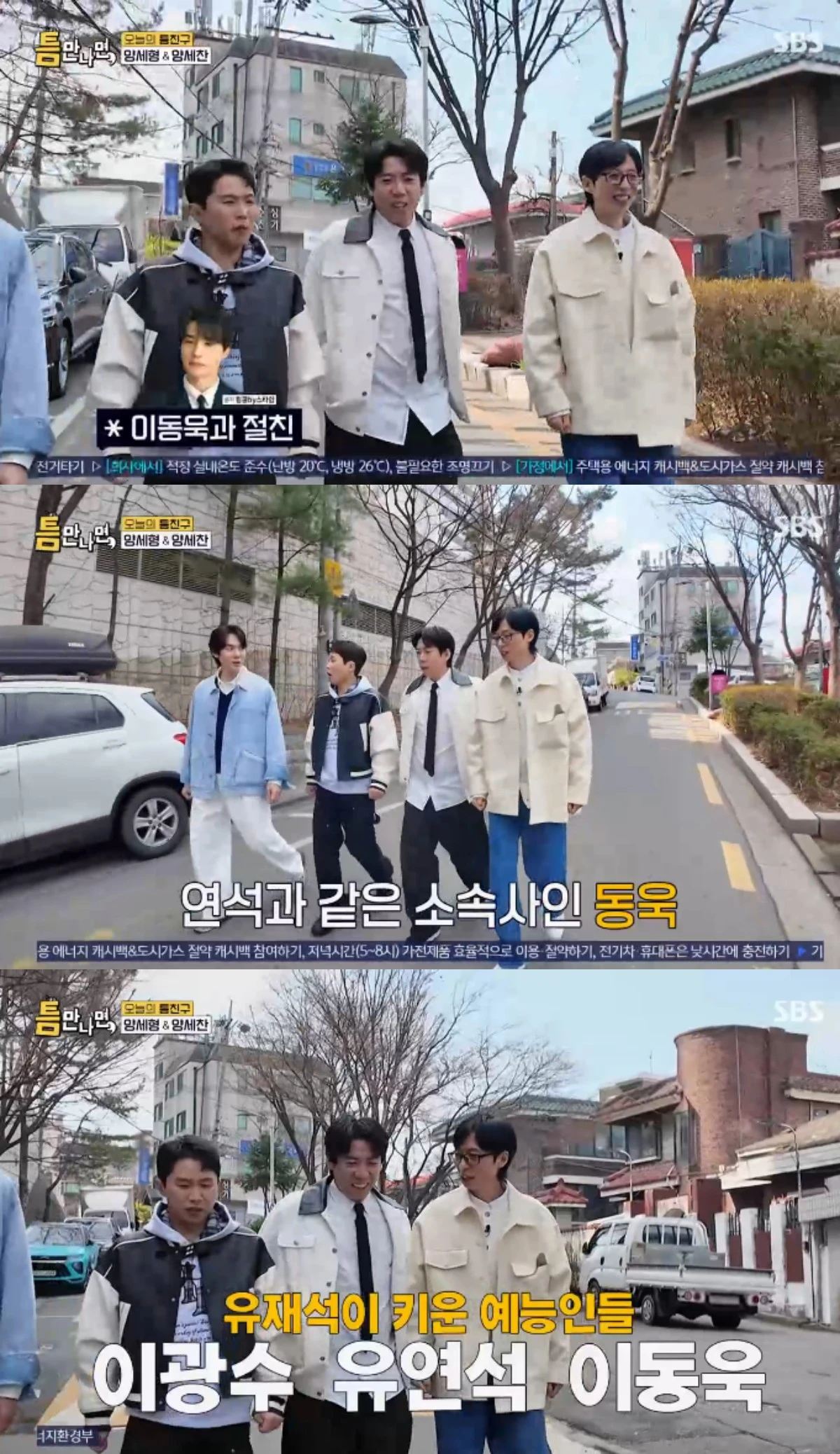 유재석은 "그리고 (이)동욱이랑도 만나지 않느냐"고 말하면서 이동욱, 유연석, 이광수의 이름을 꺼냈다. 세 사람은 같은 소속사라고.