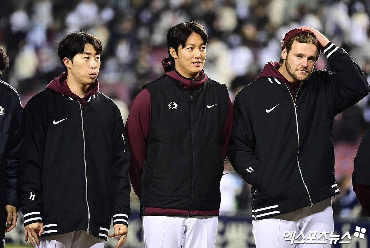 경기 종료 후 키움 안우진이 승리의 기쁨을 나누고 있다.