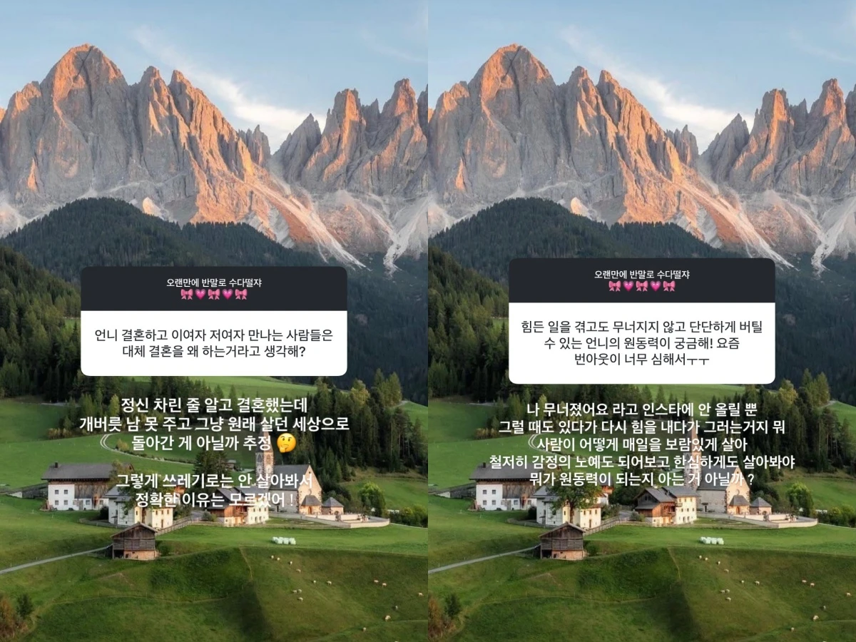 또 "힘든 일을 겪고도 무너지지 않고 단단하게 버틸 수 있는 언니의 원동력이 궁금해"라는 물음에는 "나 무너졌어요라고 인스타에 안 올릴 뿐"이라며 "그럴 때도 있다가 다시 힘을 내다가 그러는거지 뭐. 사람이 어떻게 매일을 보람있게 살아. 철저히 감정의 노예도 되어보고 한심하게도 살아봐야 뭐가 원동력이 되는지 아는 거 아닐까?"라고 털어놨다.