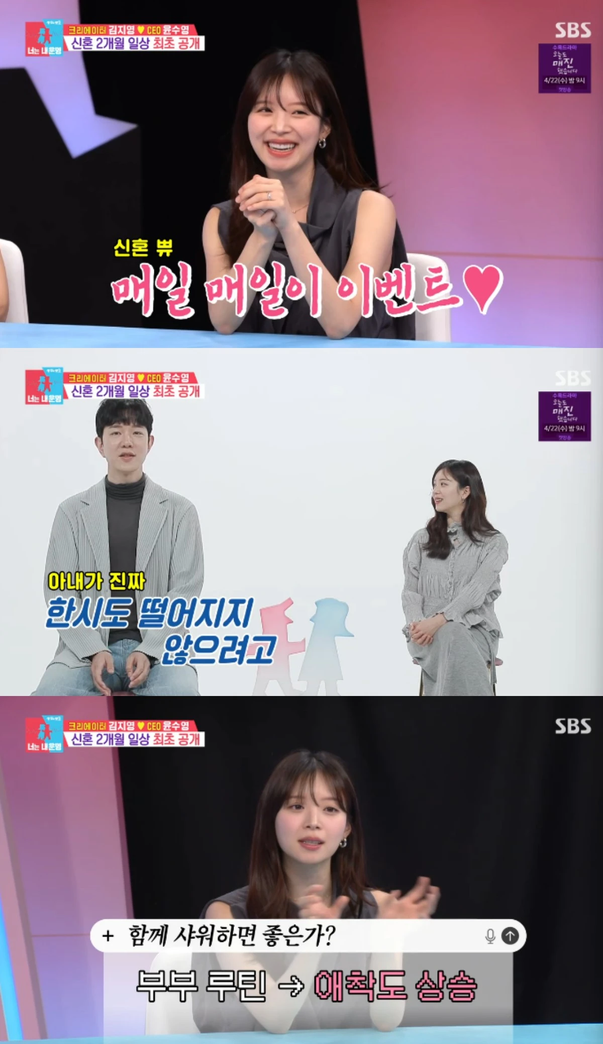 이후 남편 윤수영이 모습을 드러냈고, 뚝닥거리는 남편을 바라보며 김지영은 "귀여워~"를 연발했다.