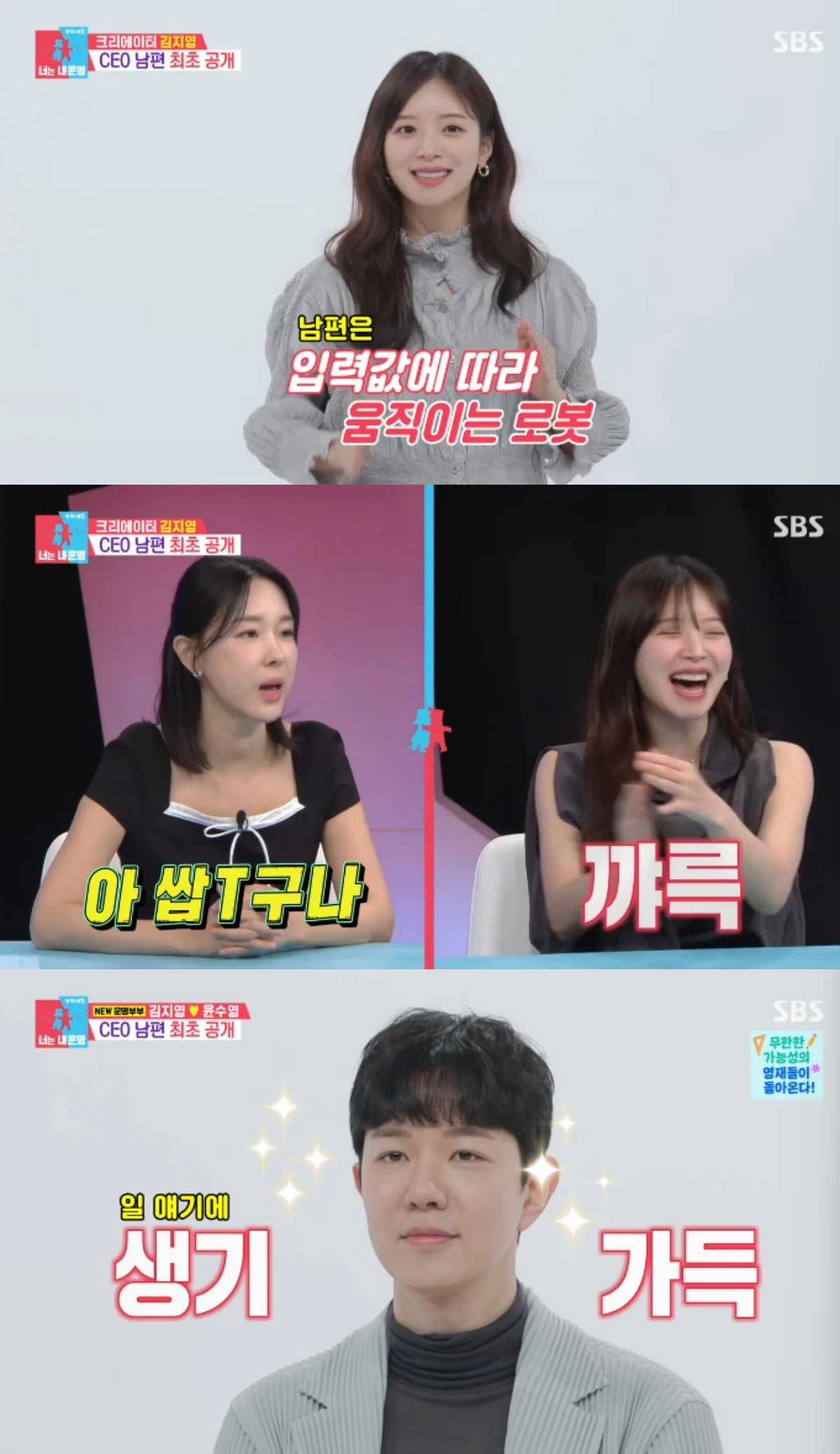 이날 방송에서 김지영은 남편 윤수영에 대해 "남편은 입력값에 따라 움직이는 로봇같은 사람이다. 쌉T다. 입력이 되면 잘 수행하는 편"이라면서 웃었다.