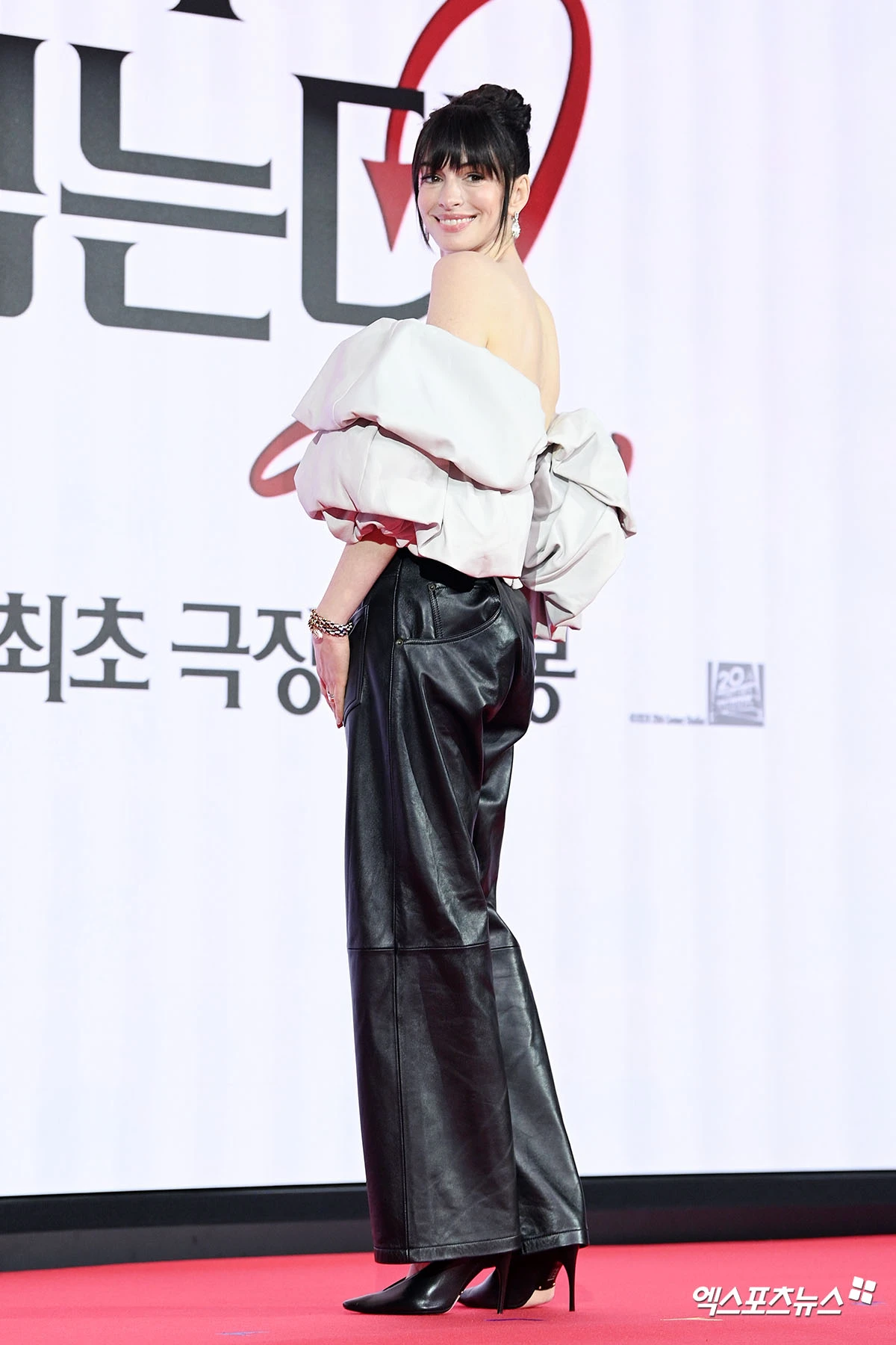 배우 앤 해서웨이가 기자간담회에 참석해 포토타임을 갖고 있다.