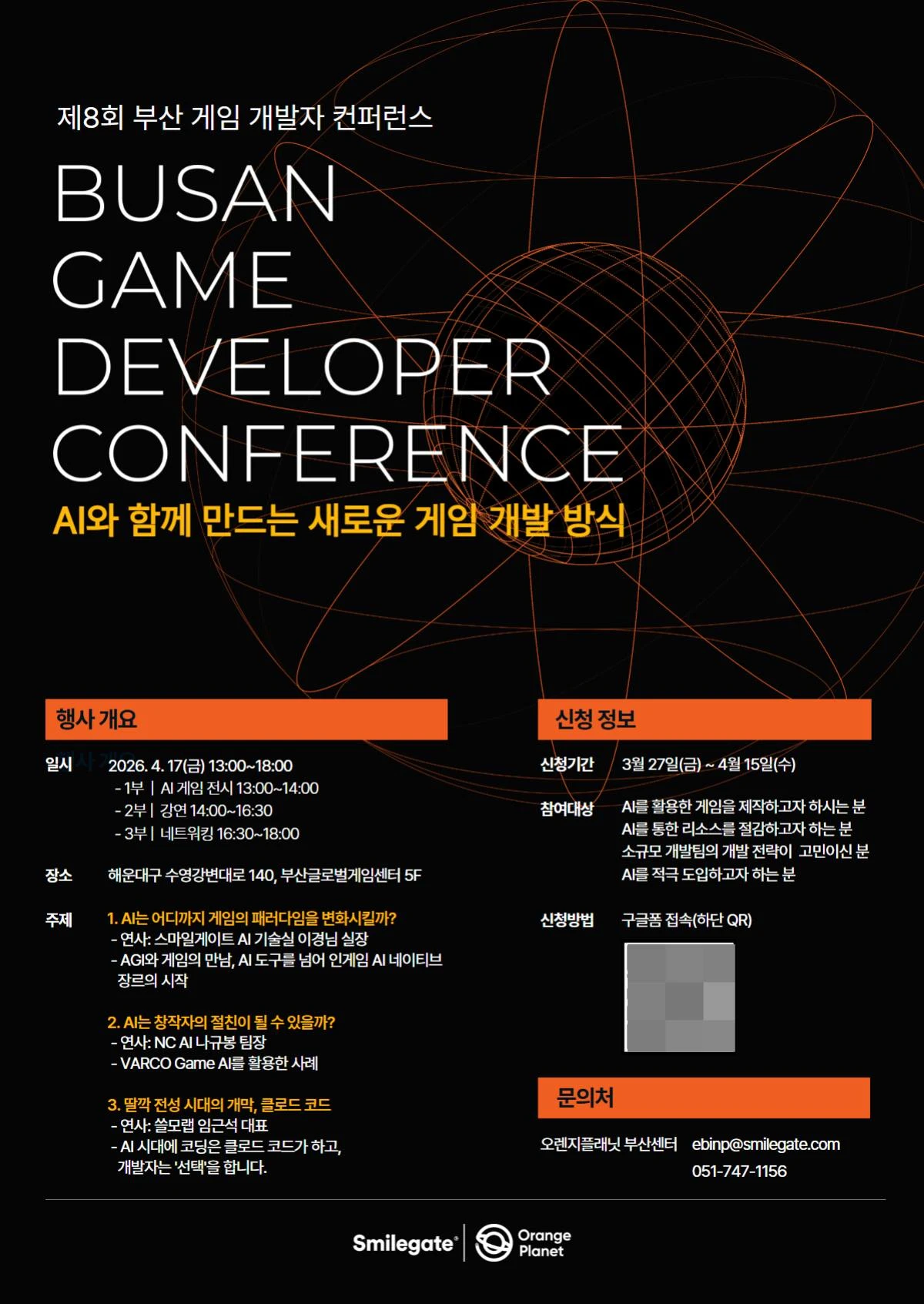 이 행사는 오렌지플래닛이 부·울·경(부산, 울산, 경북) 지역 소규모 게임사의 자생력 증진을 돕기 위해 주최하는 컨퍼런스다. 17일 부산 글로벌게임센터에서 진행하며, 참석은 이벤터스 홈페이지와 포스터 내 QR코드를 통해 신청할 수 있다.