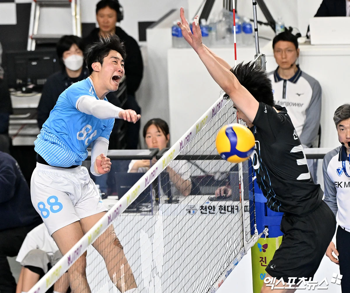 (엑스포츠뉴스 천안, 김한준 기자) 8일 오후 충남 천안유관순체육관에서 열린 '진에어 2025-2026 V-리그' 현대캐피탈과 대한항공의 챔피언결정전 4차전 경기, 대한항공 임재영이 공격을 시도하고 있다.