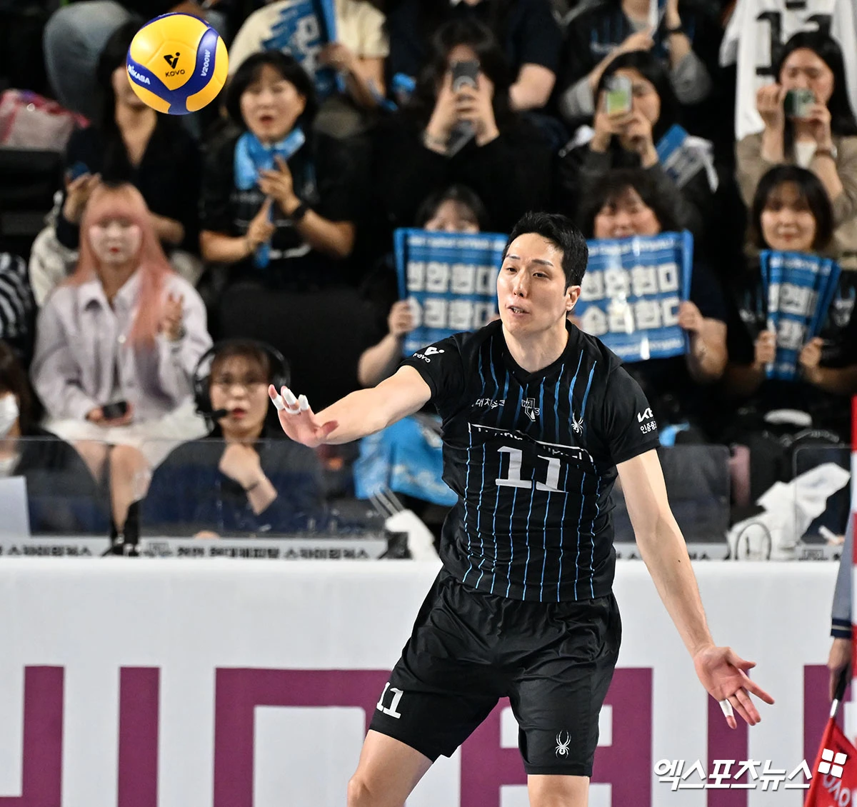 (엑스포츠뉴스 천안, 김한준 기자) 8일 오후 충남 천안유관순체육관에서 열린 '진에어 2025-2026 V-리그' 현대캐피탈과 대한항공의 챔피언결정전 4차전 경기, 현대캐피탈이 최민호가 서브를 시도하고 있다.