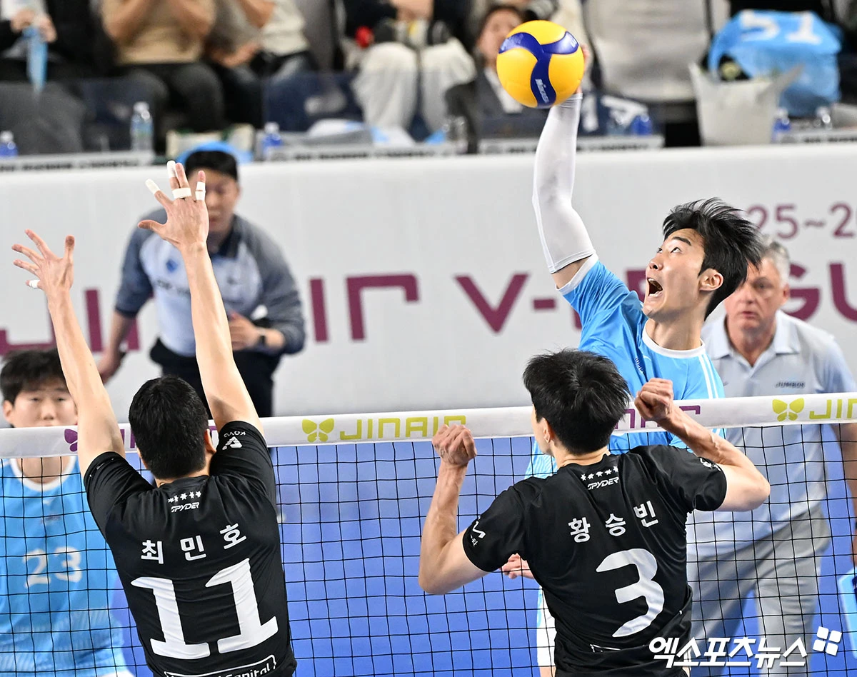 (엑스포츠뉴스 천안, 김한준 기자) 8일 오후 충남 천안유관순체육관에서 열린 '진에어 2025-2026 V-리그' 현대캐피탈과 대한항공의 챔피언결정전 4차전 경기, 대한항공 임재영이 공격을 시도하고 있다.