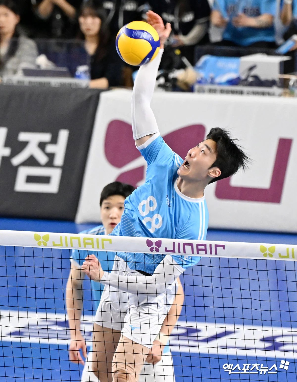 (엑스포츠뉴스 천안, 김한준 기자) 8일 오후 충남 천안유관순체육관에서 열린 '진에어 2025-2026 V-리그' 현대캐피탈과 대한항공의 챔피언결정전 4차전 경기, 대한항공 임재영이 공격을 시도하고 있다.