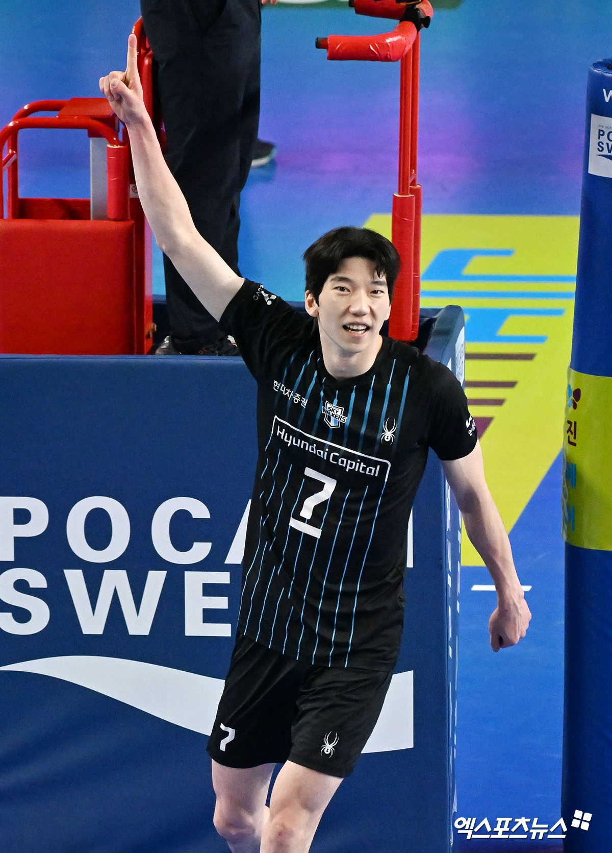 (엑스포츠뉴스 천안, 김한준 기자) 8일 오후 충남 천안유관순체육관에서 열린 '진에어 2025-2026 V-리그' 현대캐피탈과 대한항공의 챔피언결정전 4차전 경기, 현대캐피탈 허수봉이 기뻐하고 있다.