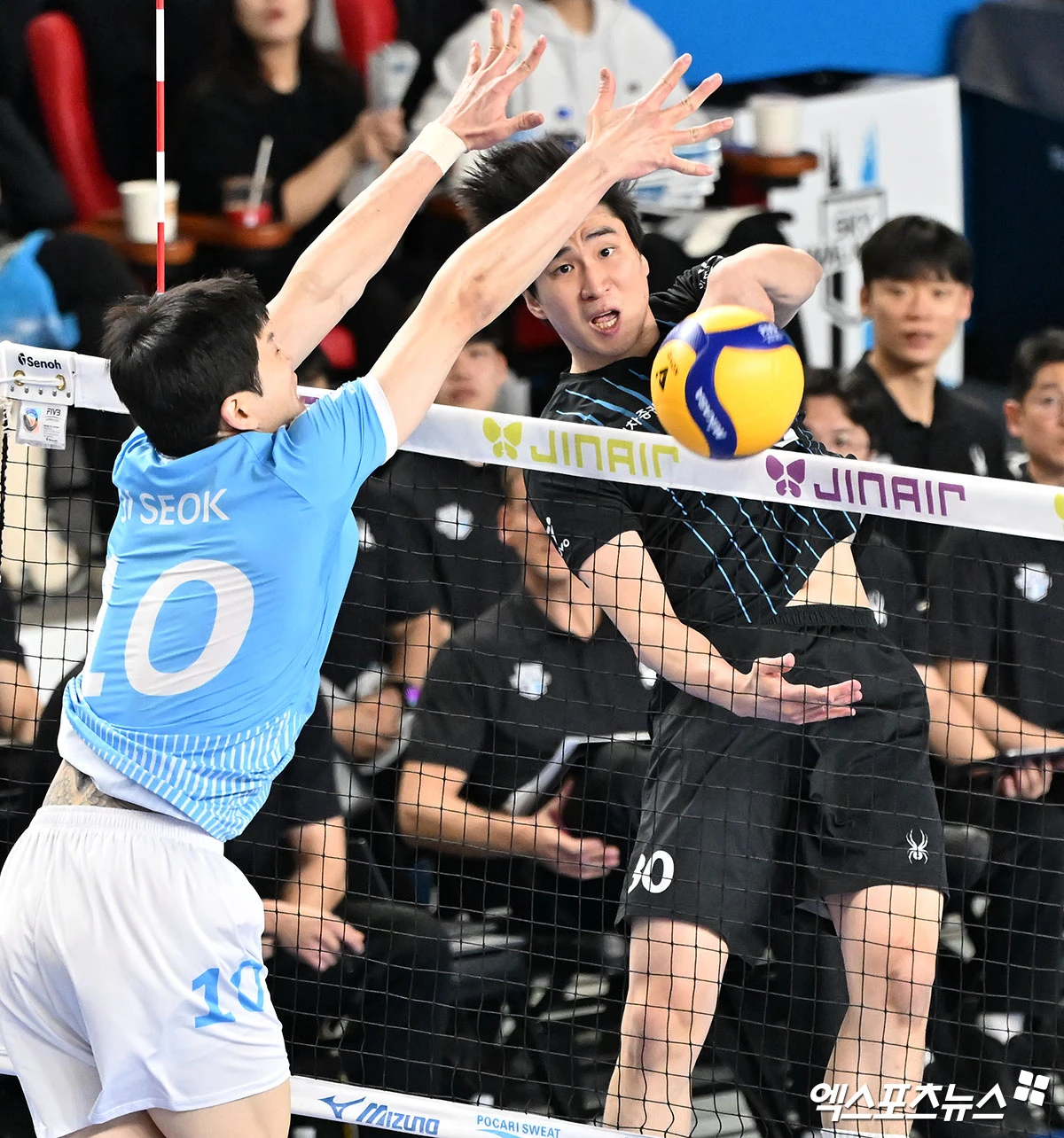 (엑스포츠뉴스 천안, 김한준 기자) 8일 오후 충남 천안유관순체육관에서 열린 '진에어 2025-2026 V-리그' 현대캐피탈과 대한항공의 챔피언결정전 4차전 경기, 현대캐피탈 신호진이 공격을 시도하고 있다.