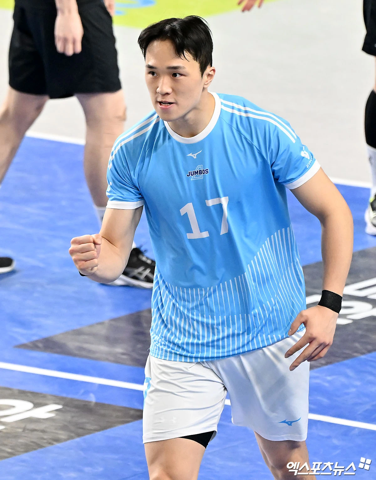 (엑스포츠뉴스 천안, 김한준 기자) 8일 오후 충남 천안유관순체육관에서 열린 '진에어 2025-2026 V-리그' 현대캐피탈과 대한항공의 챔피언결정전 4차전 경기, 대한항공 임동혁이 기뻐하고 있다.