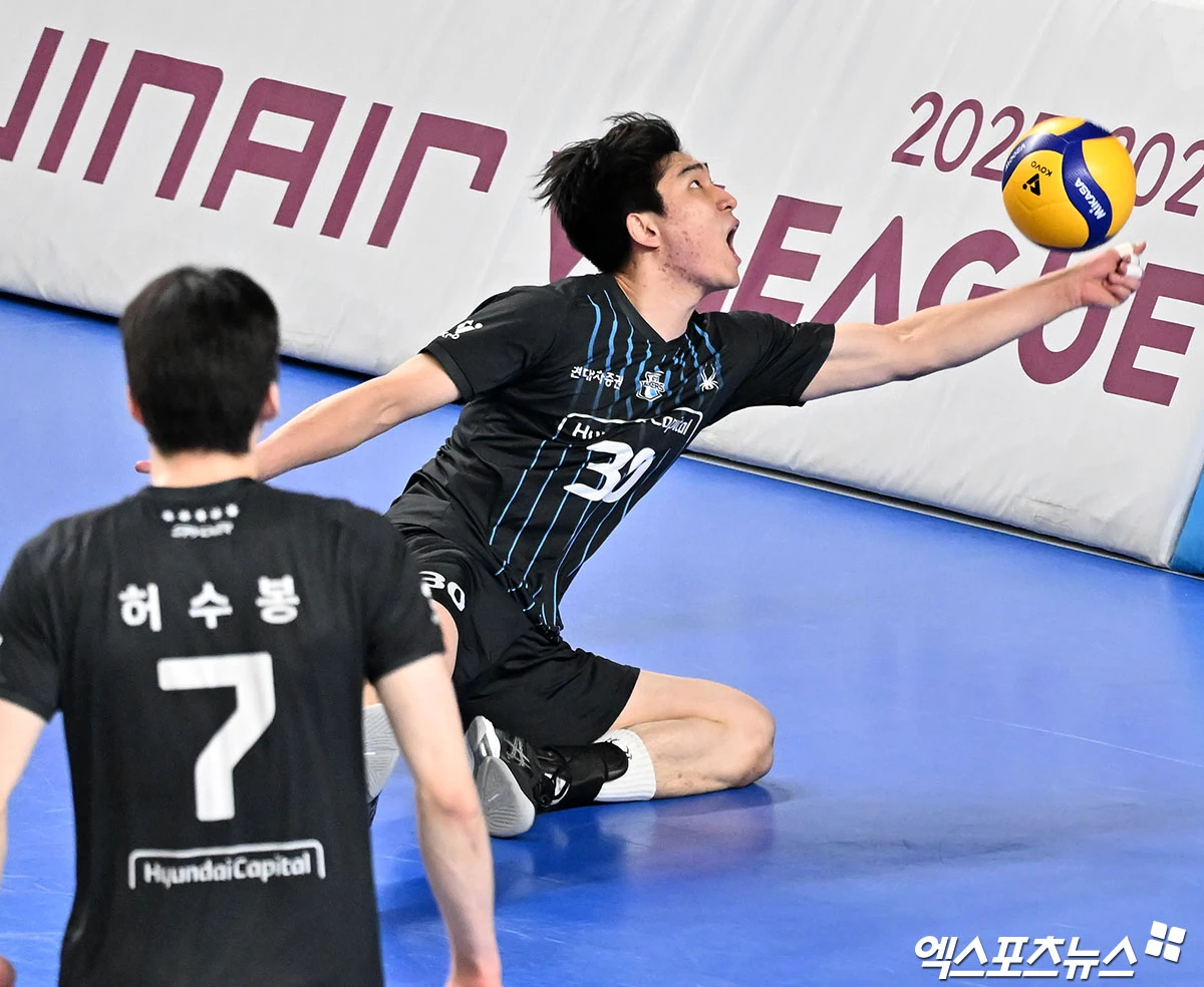 (엑스포츠뉴스 천안, 김한준 기자) 8일 오후 충남 천안유관순체육관에서 열린 '진에어 2025-2026 V-리그' 현대캐피탈과 대한항공의 챔피언결정전 4차전 경기, 현대캐피탈 신호진이 디그를 하고 있다.