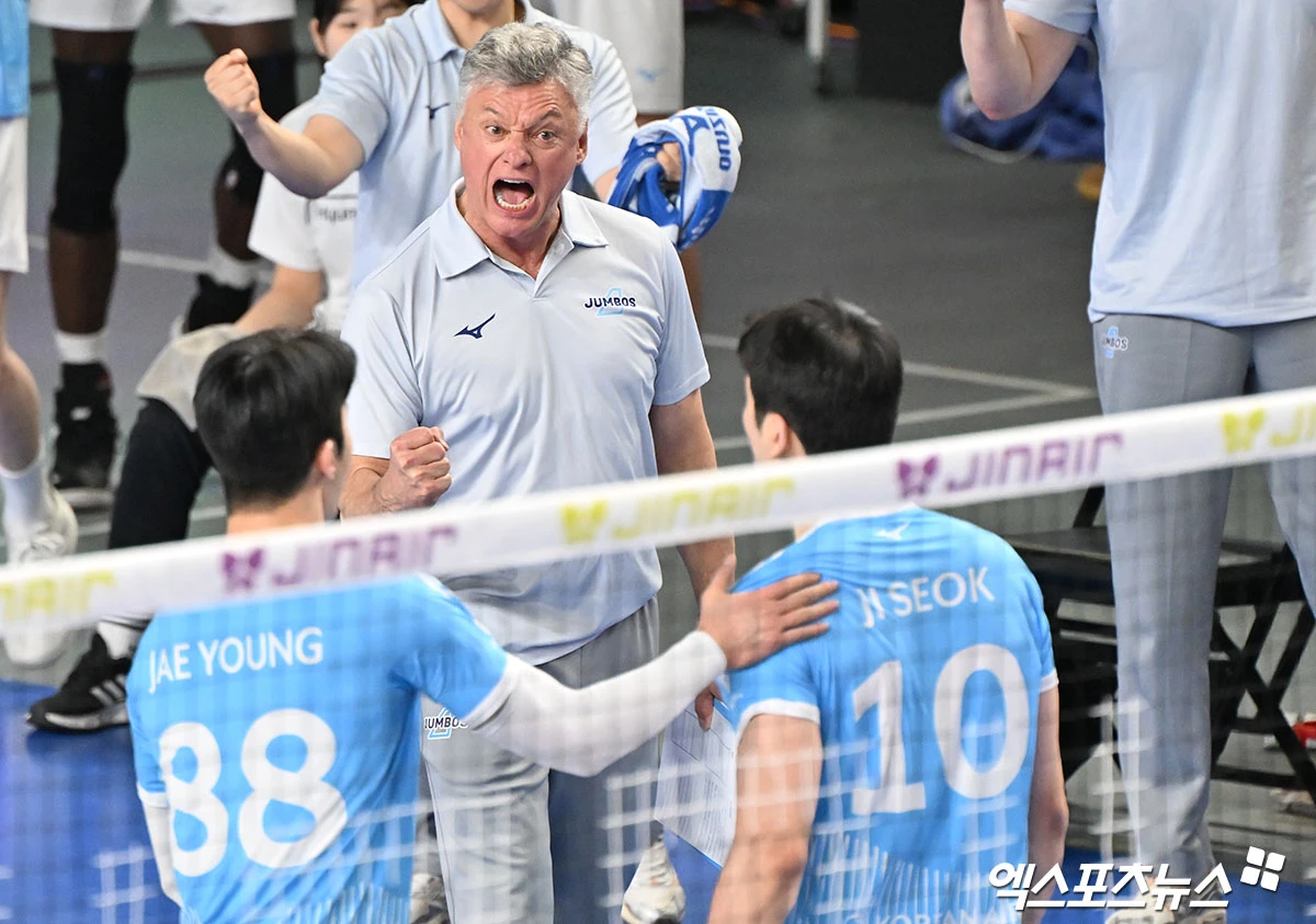 (엑스포츠뉴스 천안, 김한준 기자) 8일 오후 충남 천안유관순체육관에서 열린 '진에어 2025-2026 V-리그' 현대캐피탈과 대한항공의 챔피언결정전 4차전 경기, 대한항공 헤난 감독이 기뻐하고 있다.