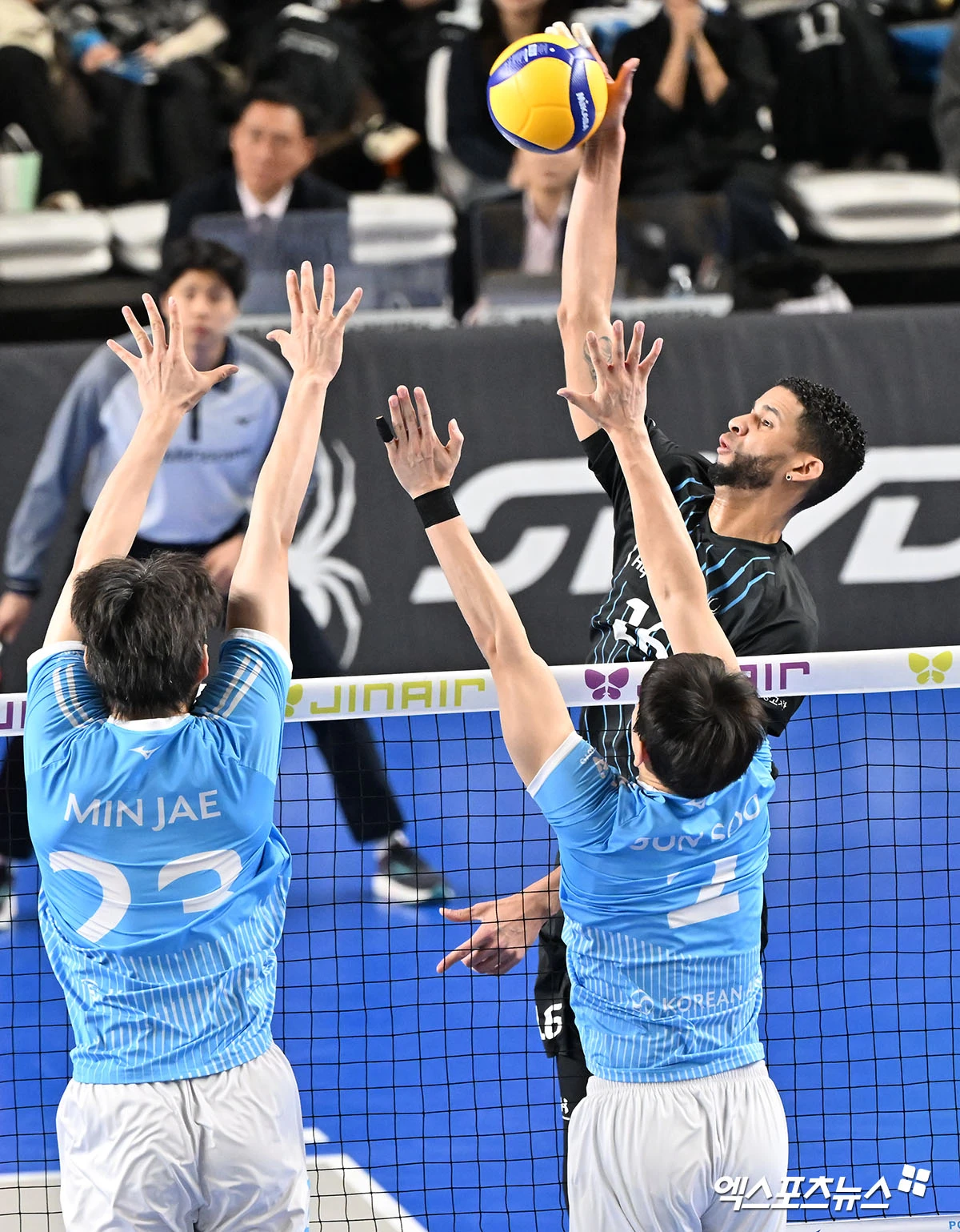 (엑스포츠뉴스 천안, 김한준 기자) 8일 오후 충남 천안유관순체육관에서 열린 '진에어 2025-2026 V-리그' 현대캐피탈과 대한항공의 챔피언결정전 4차전 경기, 현대캐피탈 레오가 공격을 시도하고 있다.