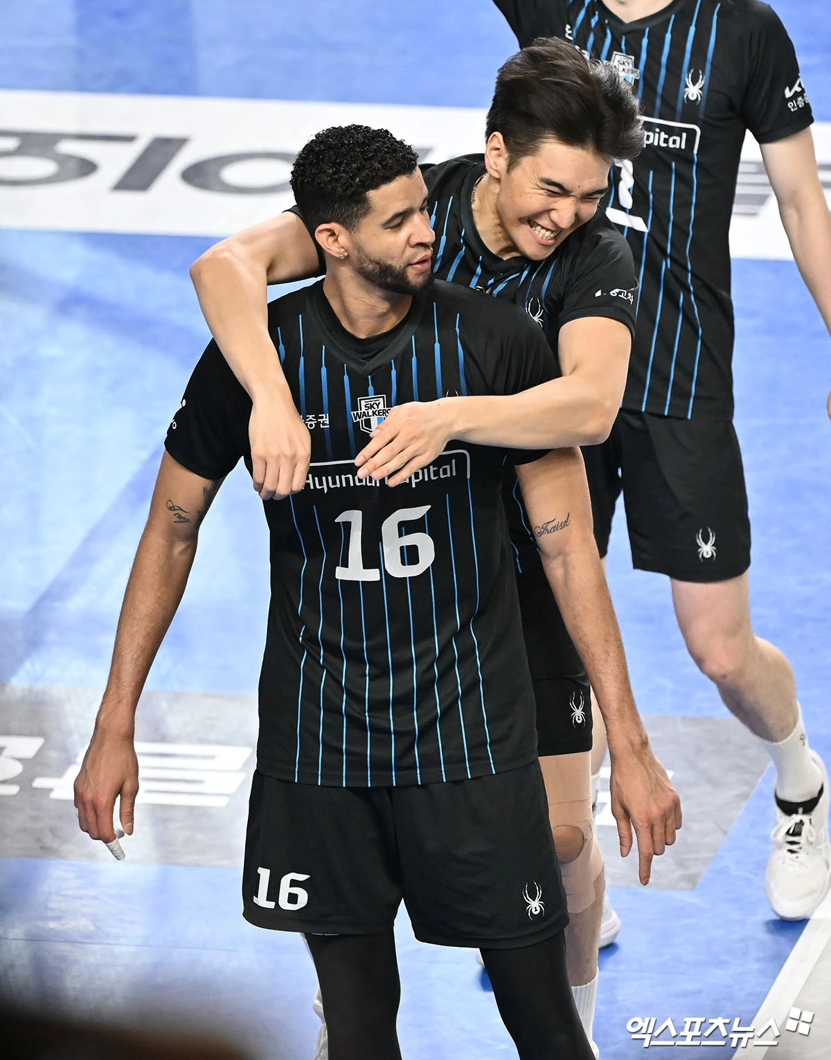 현대캐피탈 레오와 바야르사이한이 기뻐하고 있다.