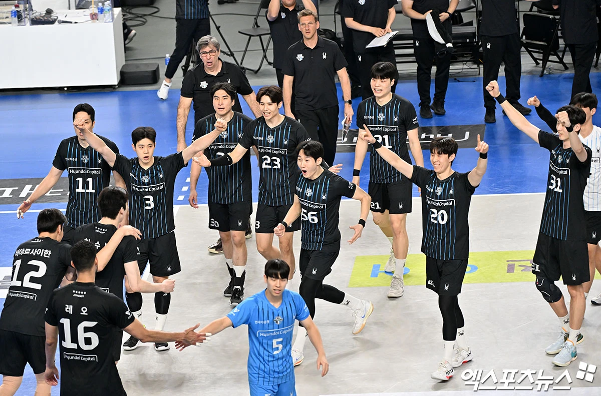 현대캐피탈 선수들이 기뻐하고 있다.