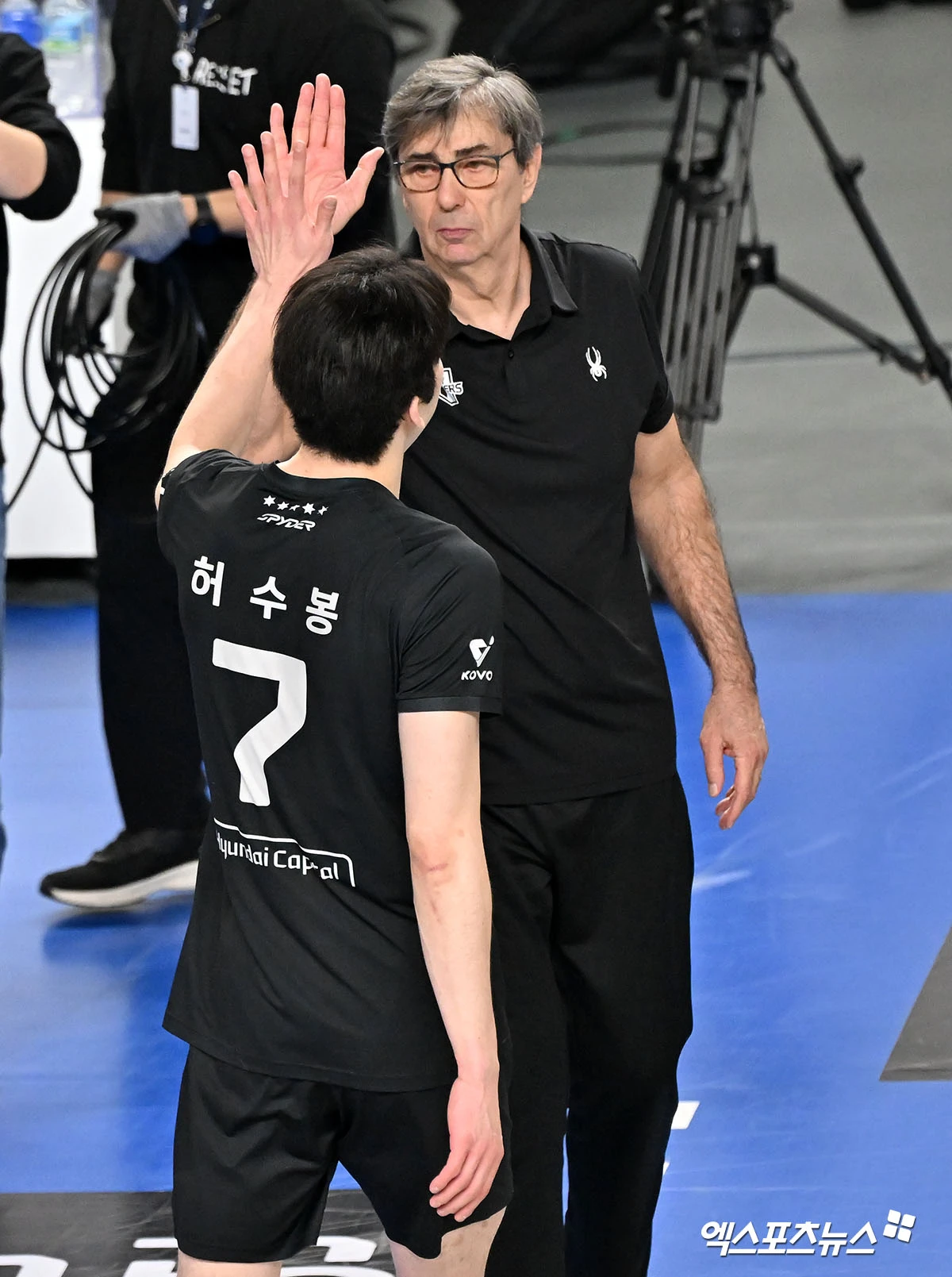 현대캐피탈 필립 블랑 감독이 허수봉과 하이파이브를 하고 있다.