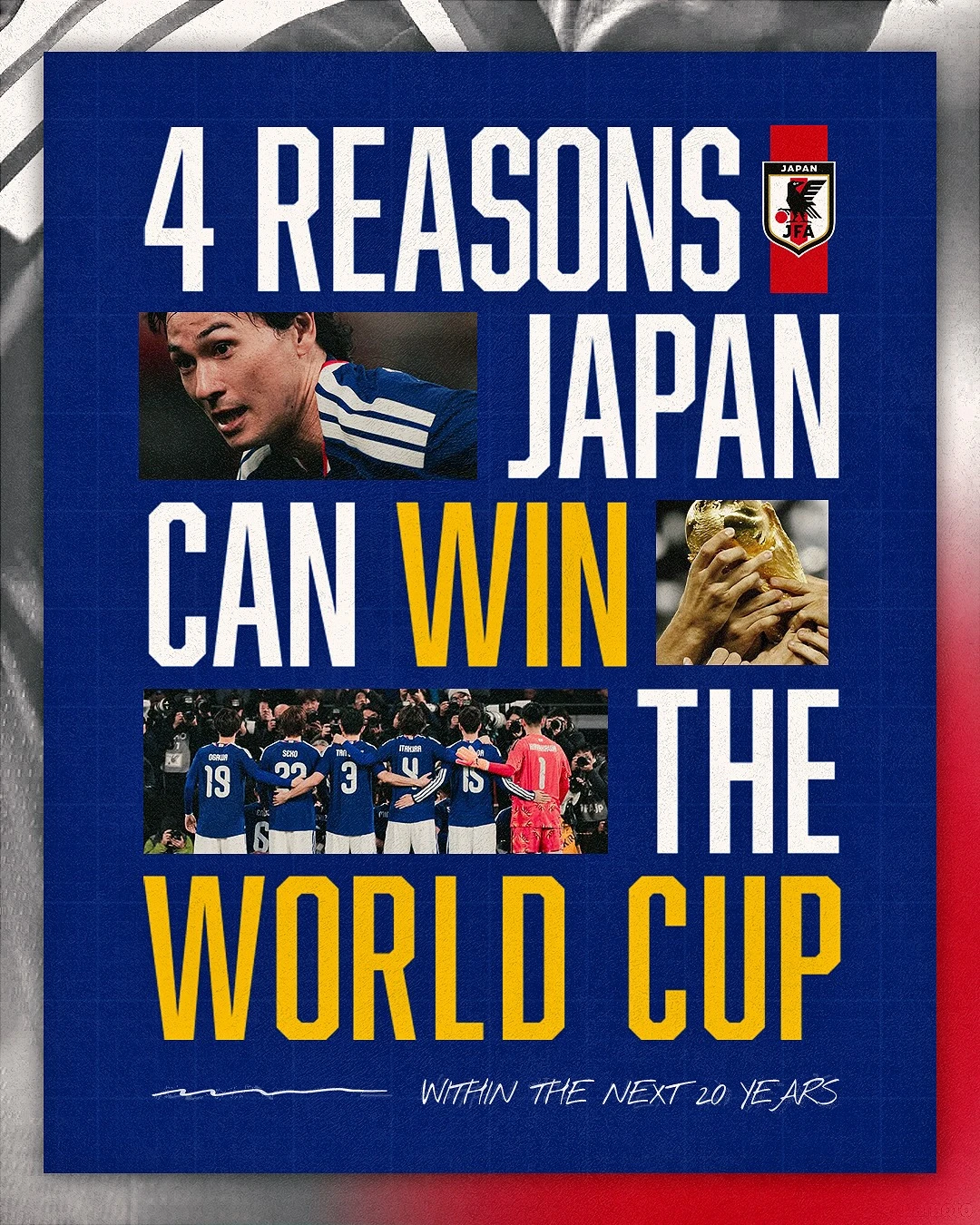 일본 축구 콘텐츠를 다루는 J리그디자인은 8일 SNS를 통해 "일본이 과연 월드컵에서 우승할 수 있을까? 아시아 최초로 세계 챔피언이 될 수 있는 4가지 이유"라며 일본이 월드컵에서 우승할 수 있는 이유를 설명했다.