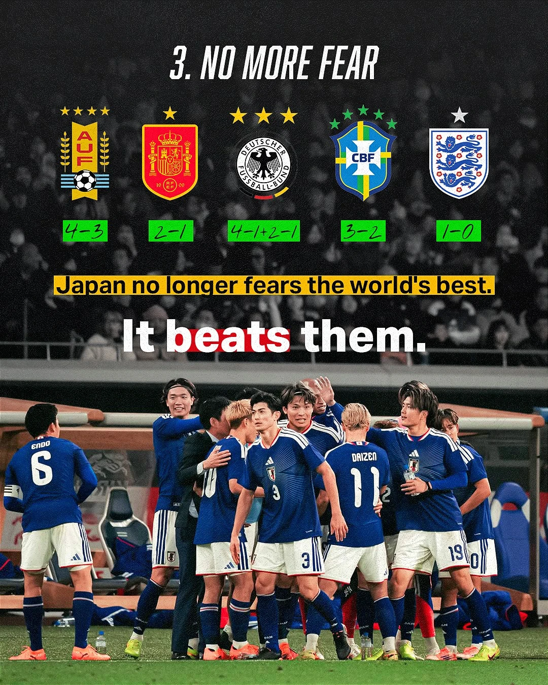 최근 일본은 우루과이, 스페인, 독일, 브라질, 잉글랜드 같은 강호들을 상대로 승리를 거뒀다. 세계적 강티들을 무서워하는 팀이 아니라, 실제로 이기는 팀이 됐다는 게 포인트다.